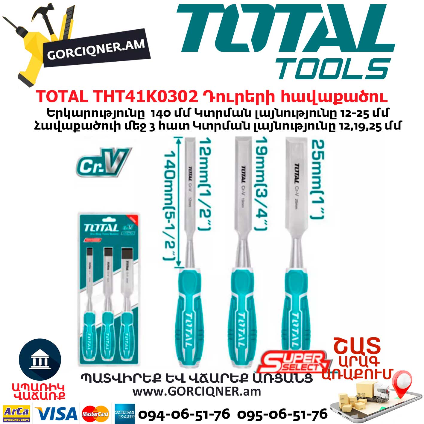 A set of wood chisels 3 pcs. TOTAL THT41K0302 – a set of hand carpentry tools of the most common sizes. The working part of the chisel is made of chrome-vanadium steel and is highly durable. Ergonomic handles provide a secure hold of products in the hand and no slippage.
