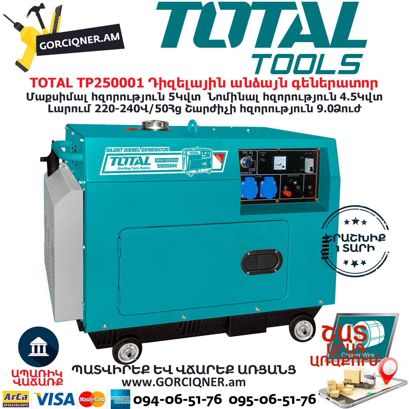 - Total TP250001 diesel generators, the design of the device is elegance, easy operation and high durability with a weight of 172 kg, including wheels and manual pulling force, help to move easily and conveniently in the family, in the factory.