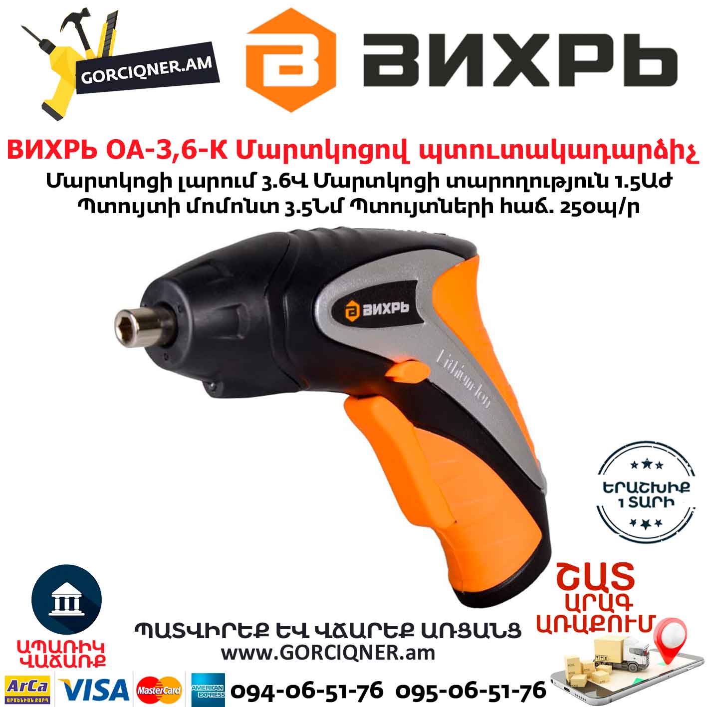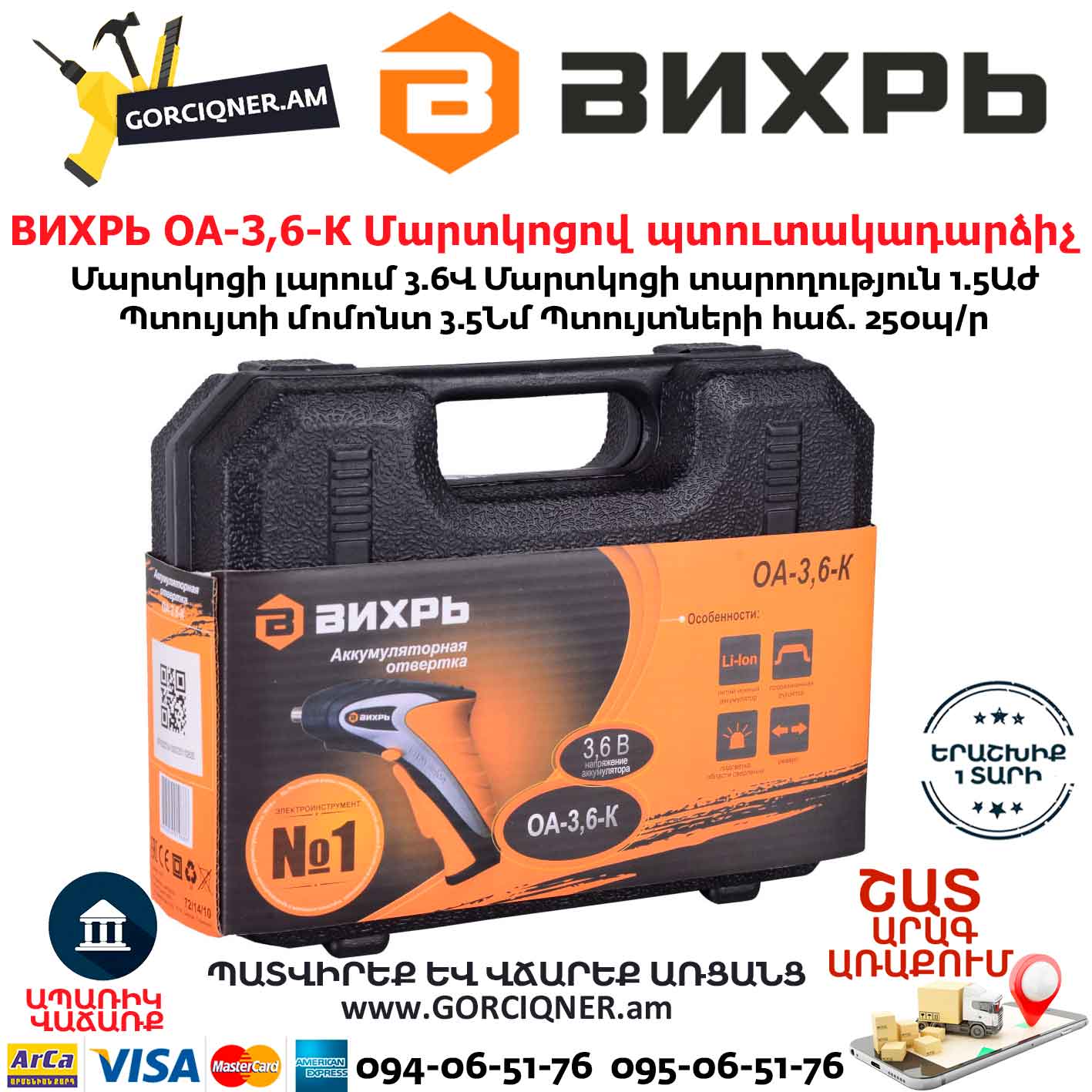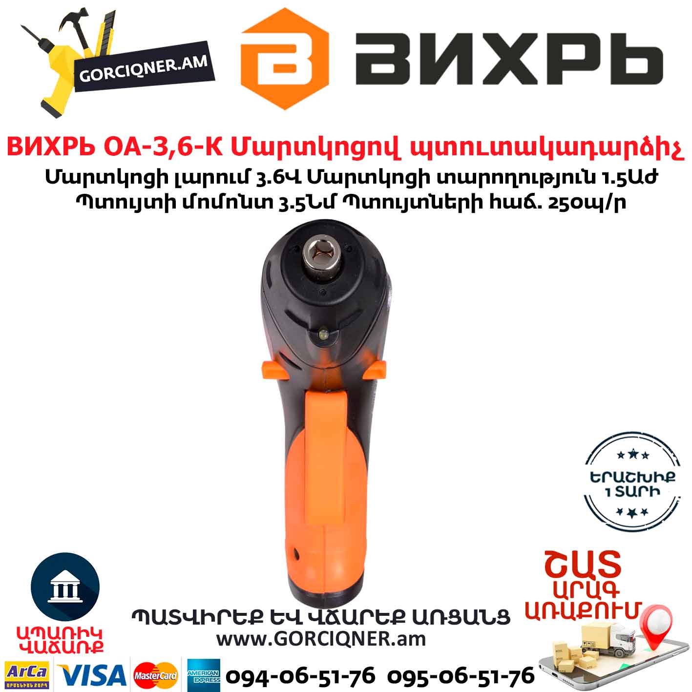 ВИХРЬ ОА-3,6-К Մարտկոցով պտուտակադարձիչ 3.6Վ 72/14/10