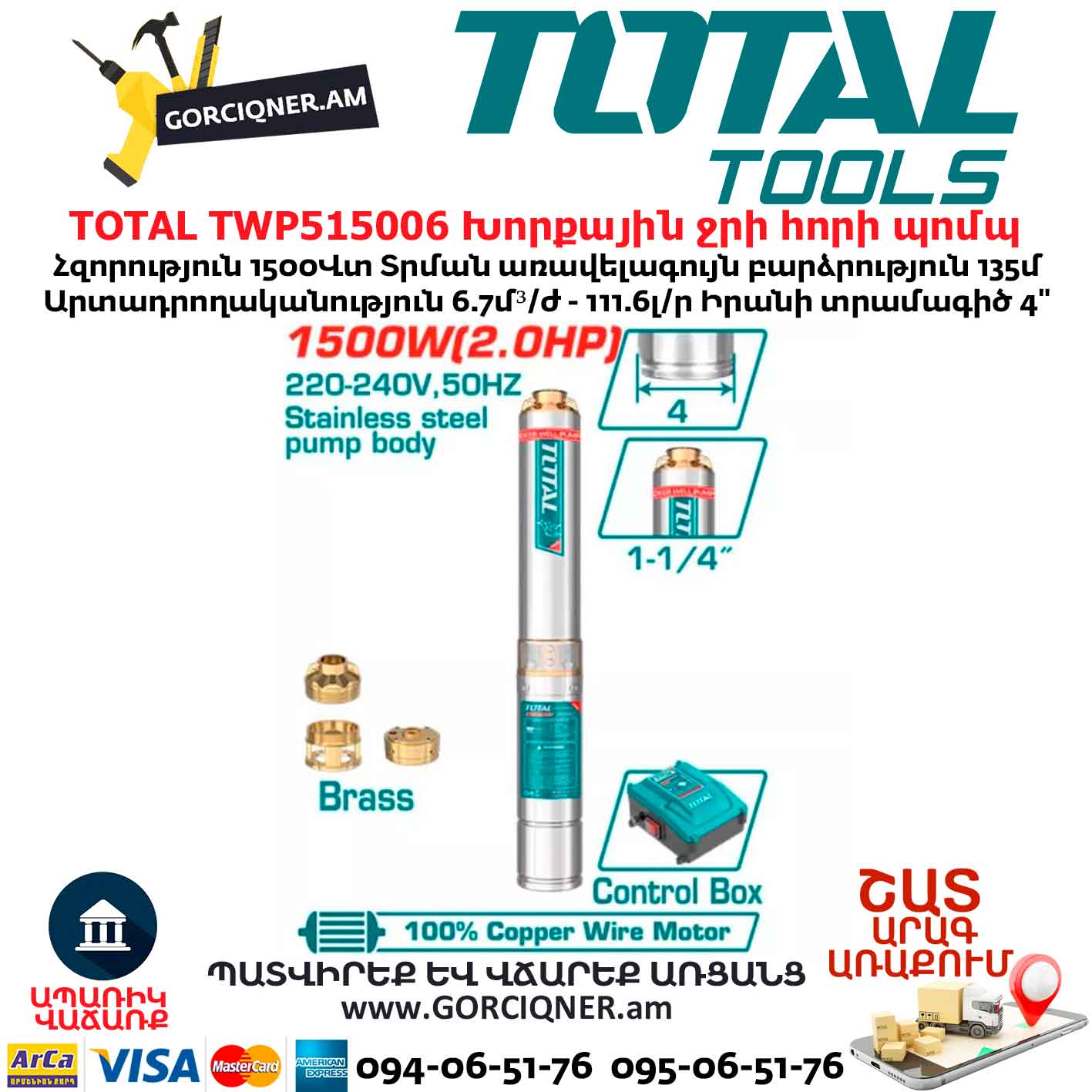 Խորքային ջրի հորի պոմպ TOTAL TWP515006 1500Վտ/6.7մ³/135մ