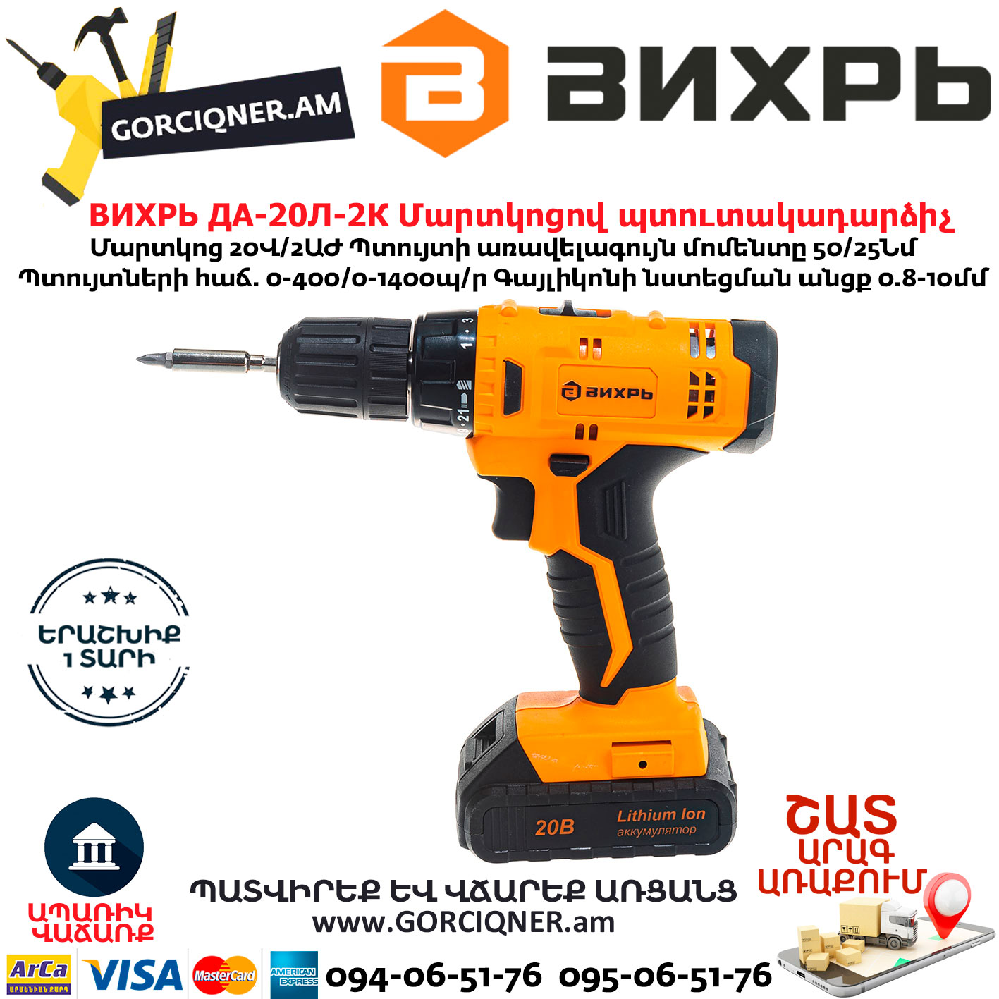 ВИХРЬ ДА-20Л-2К Մարտկոցով պտուտակադարձիչ 20Վ 72/14/21