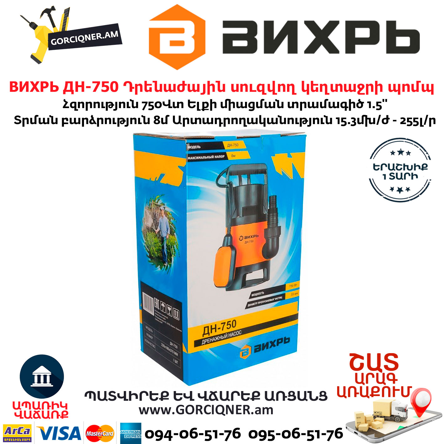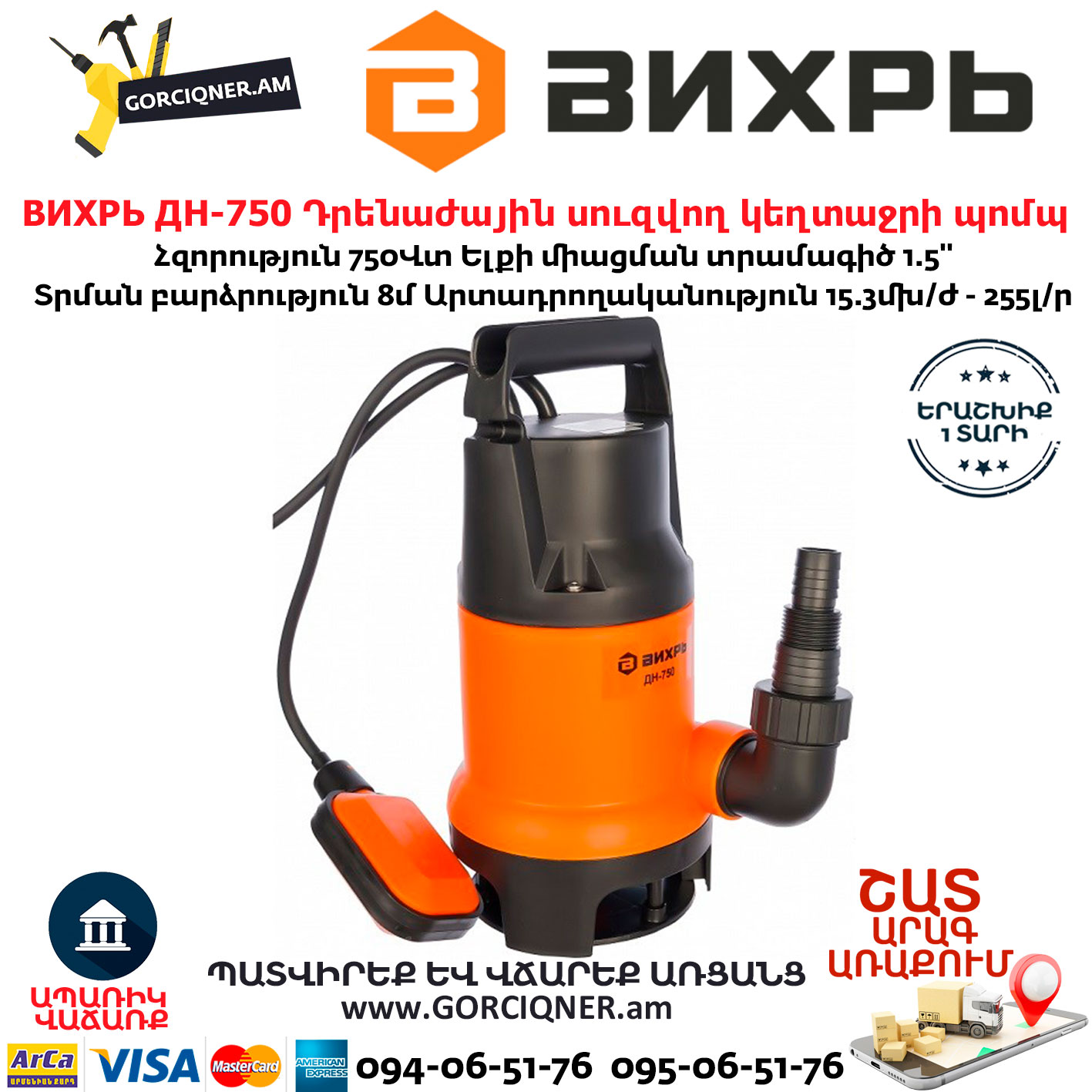 ВИХРЬ ДН-750 Դրենաժային սուզվող կեղտաջրի պոմպ 1.5” / 750Վտ 68/2/2
