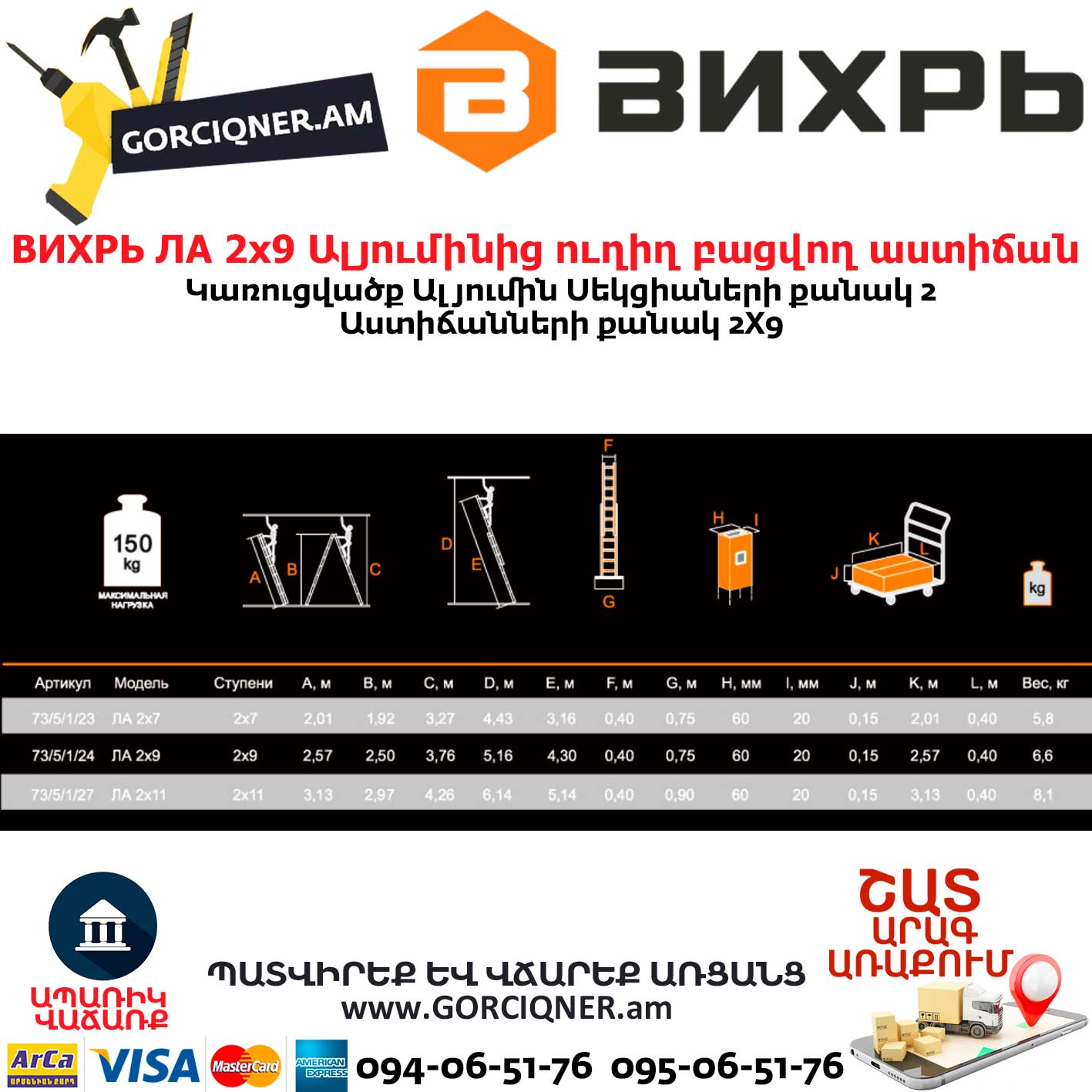 ВИХРЬ ЛА 2х9 Ալյումինից ուղիղ բացվող աստիճան 2.5/3.76մ 73/5/1/24