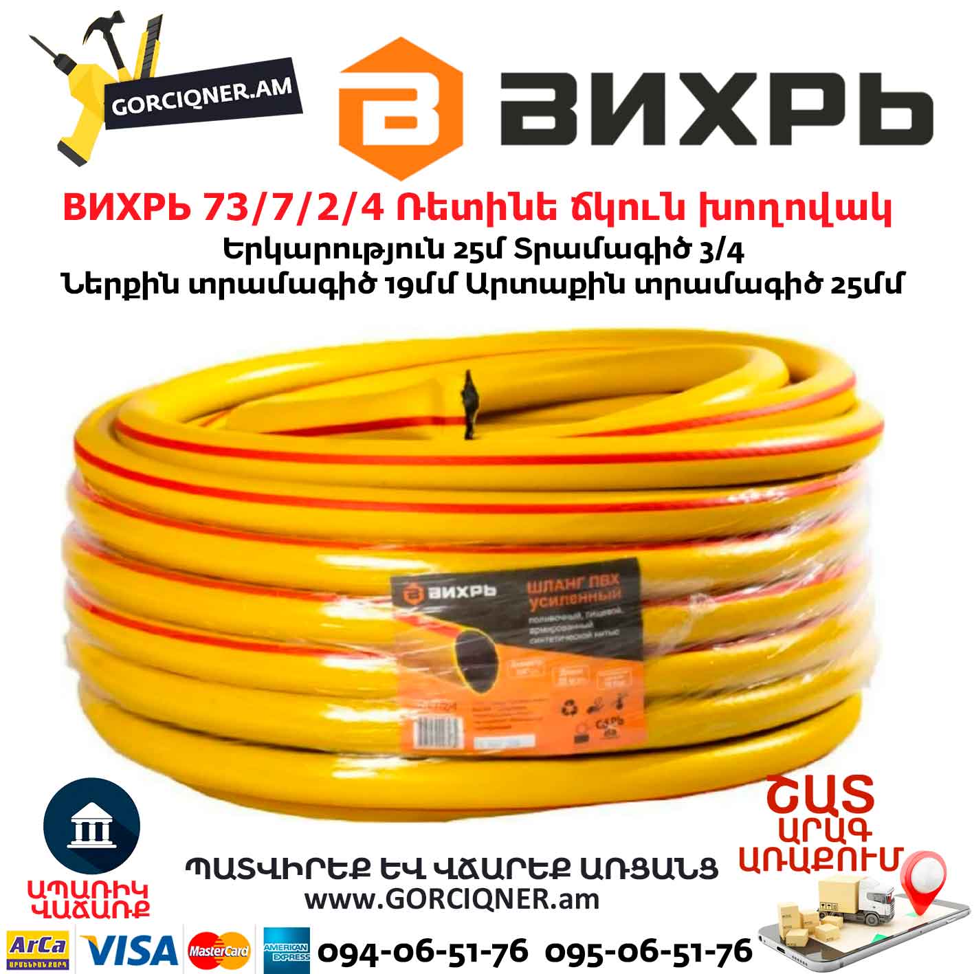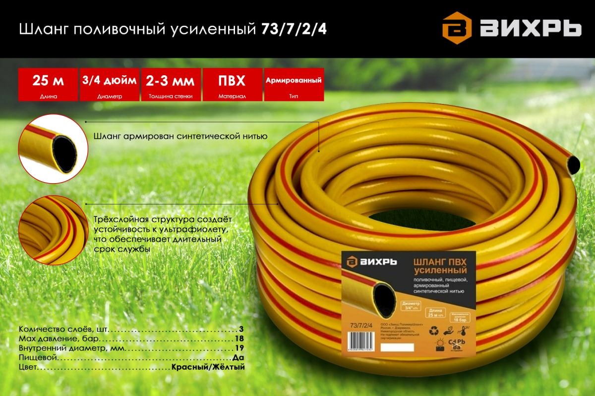 ВИХРЬ 73/7/2/4 Ռետինե ճկուն խողովակ 3/4”-25մ ПВХ (ՍՆՆԴԱՅԻՆ, ԵՌԱՇԵՐՏ)