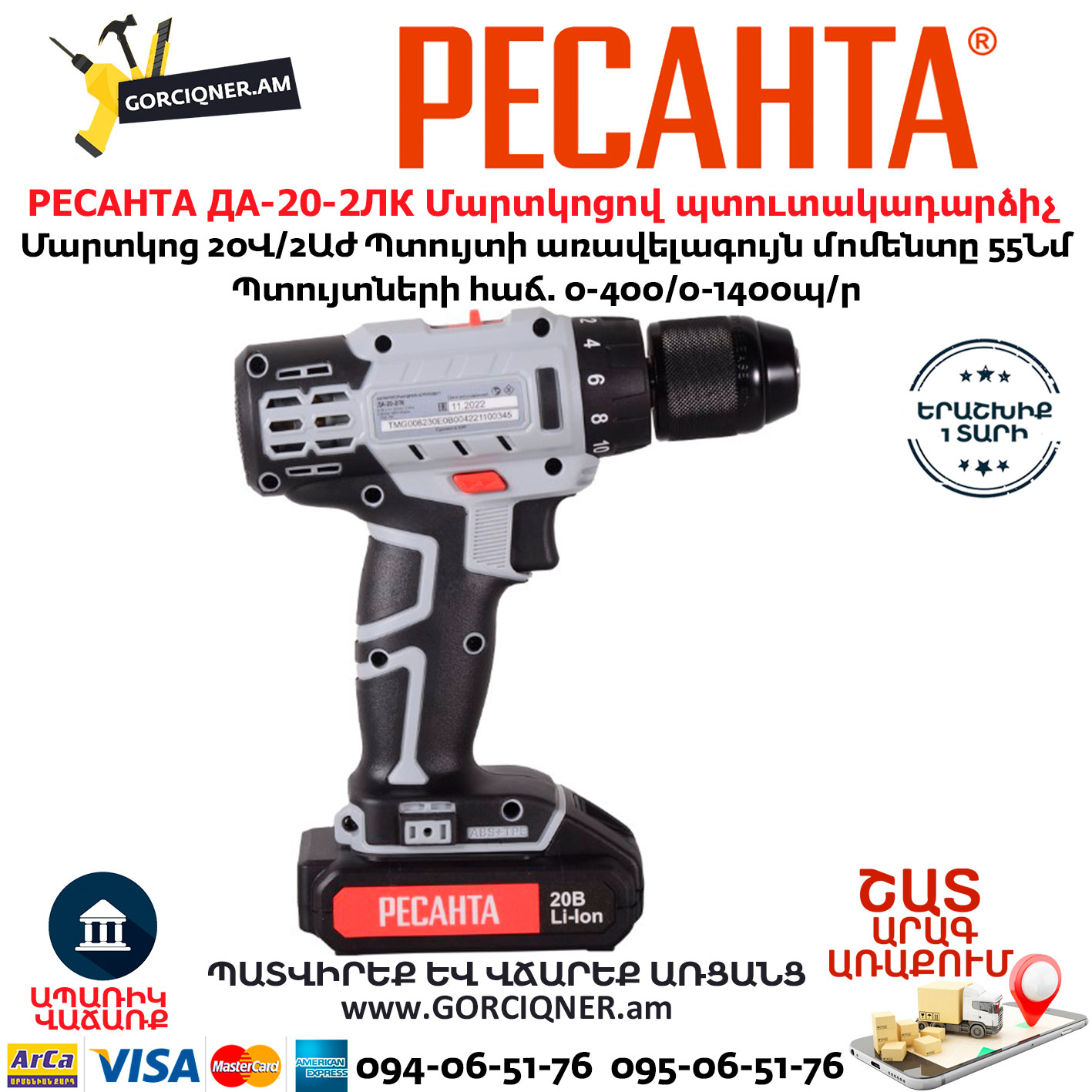 РЕСАНТА ДА-20-2ЛК Մարտկոցով պտուտակադարձիչ
