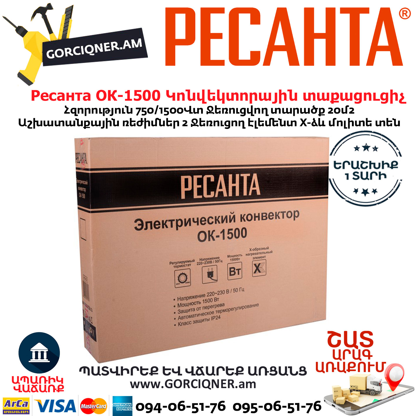РЕСАНТА ОК-1500 Կոնվեկտորային տաքացուցիչ 1500Վտ 67/4/23