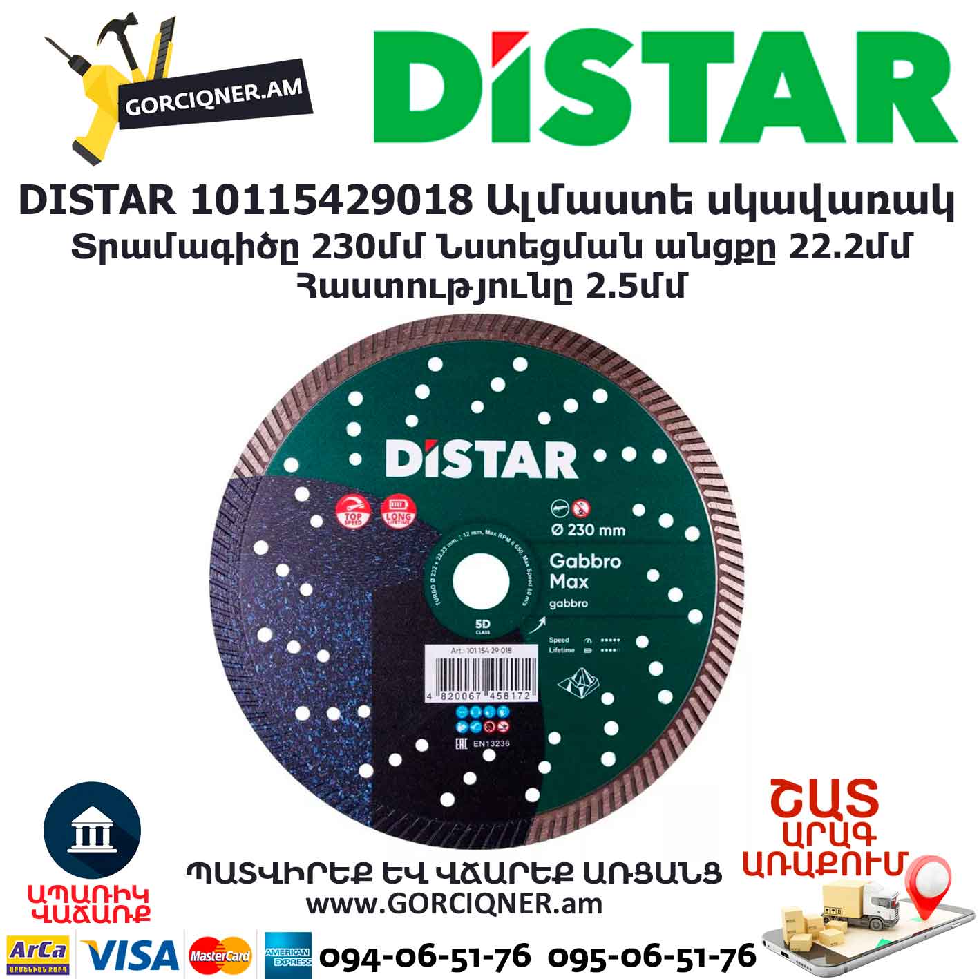 Distar Gabbro Max 230մմ գերարագ սկավառակը նախատեսված է «Գաբբրո» տեսակի գրանիտի կտրման համար։ Ալմաստային շերտի բարձրությունը՝ 12մմ։