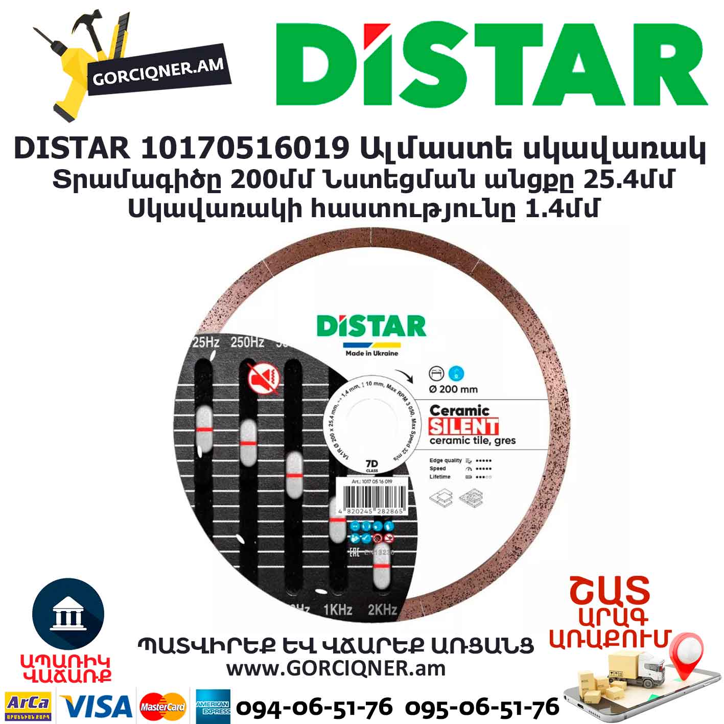 Կերամոգրանիտի կտրումը աղմկոտ աշխատանք է։ Այս ակտուալ խնդրի համար լավագույն լուծումը Distar Ceramic Silent սենդվիչային սկավառակն է։ Այսպիսի կառուցվածքը նվազեցնում է բարձր հաճախականությունները, ինչի շնորհիվ փաստացի լսելի է միայն գործիքի/սարքի շարժիչի աղմուկը։ Տվյալ սկավառակի հիմքը Hard Ceramics Advanced սկավառակն է։ Առավելությունները. – կատարյալ եզրեր, – կերամոգրանիտի հաստությունը՝ 20մմ, – աղմուկի մակարդակը՝ 10դԲ, – կիրառվում է միայն թաց կտրմամբ (ջրային հովացմամբ)։