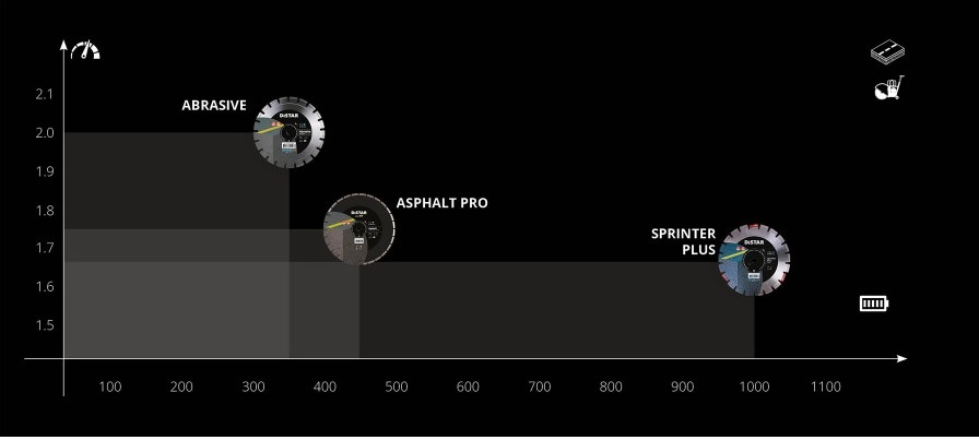 • Ասֆալտը և ասֆալտբետոնը 7 սանտիմետրից ավելի խորության վրա կտրելիս խորհուրդ է տրվում օգտագործել լրացուցիչ սառեցում ջրով և, ի լրումն, աշխատանքներ կատարել մի քանի մոտեցումներով, ինչը կնվազեցնի գործիքի մաշվածությունը և կբարձրացնի արտադրողականությունը: