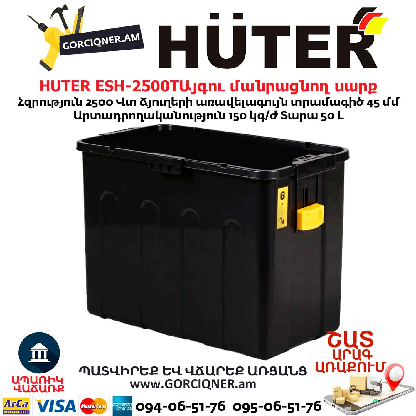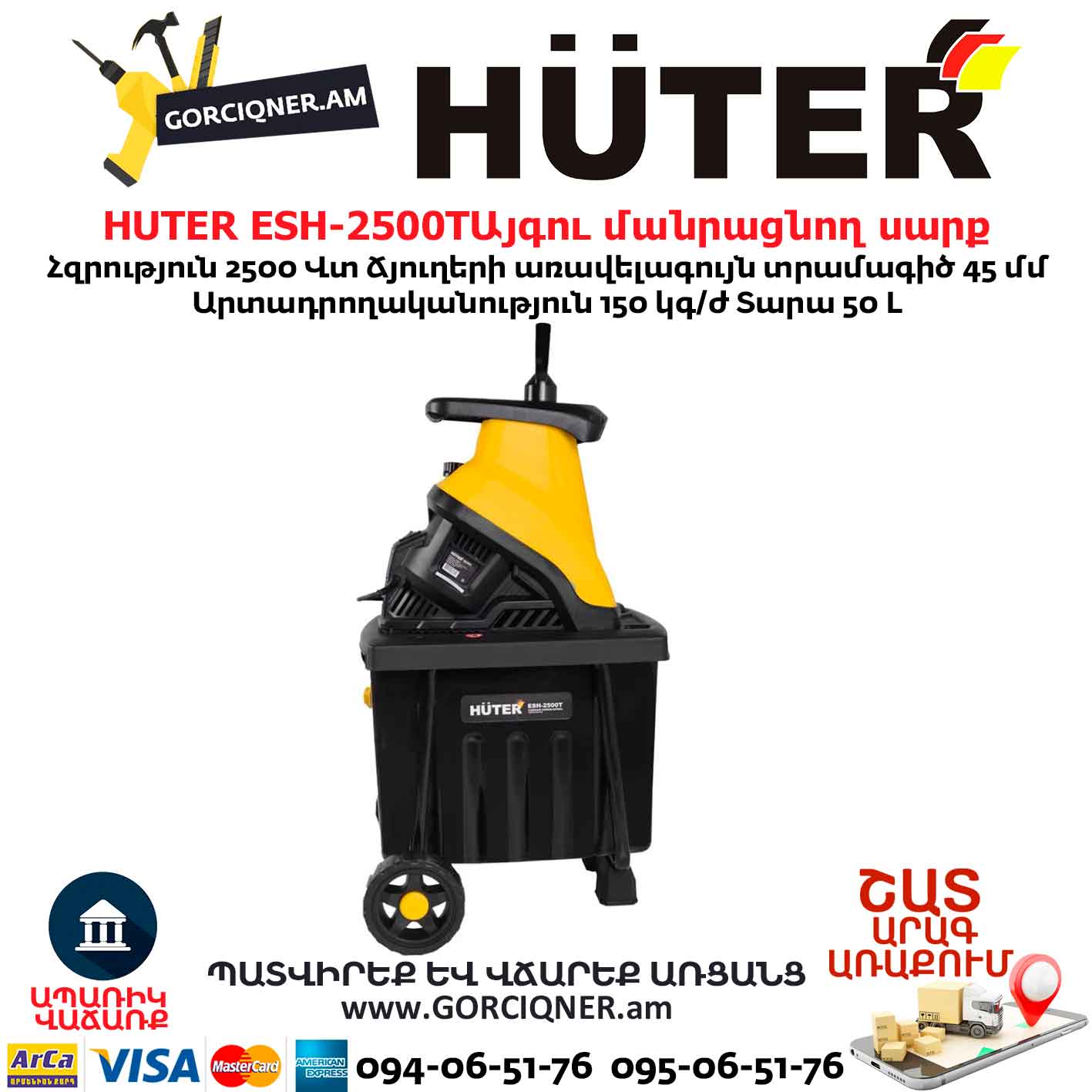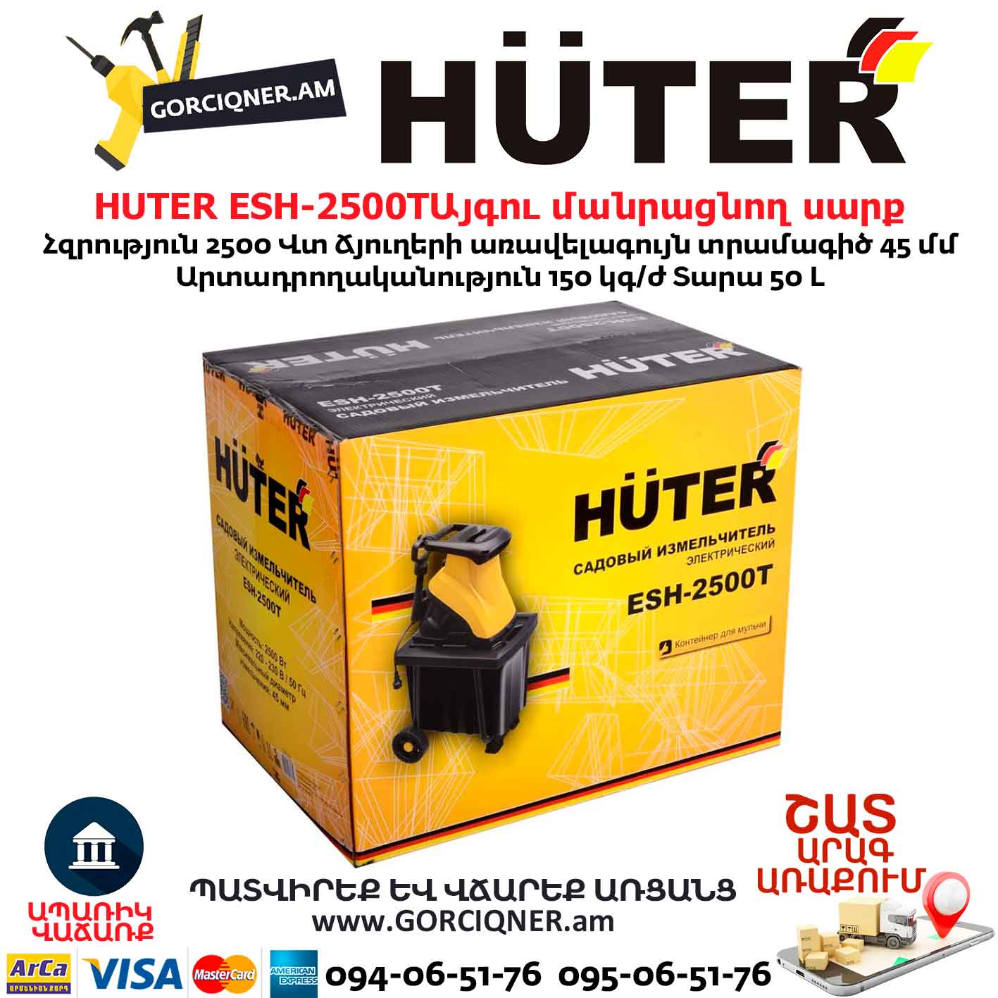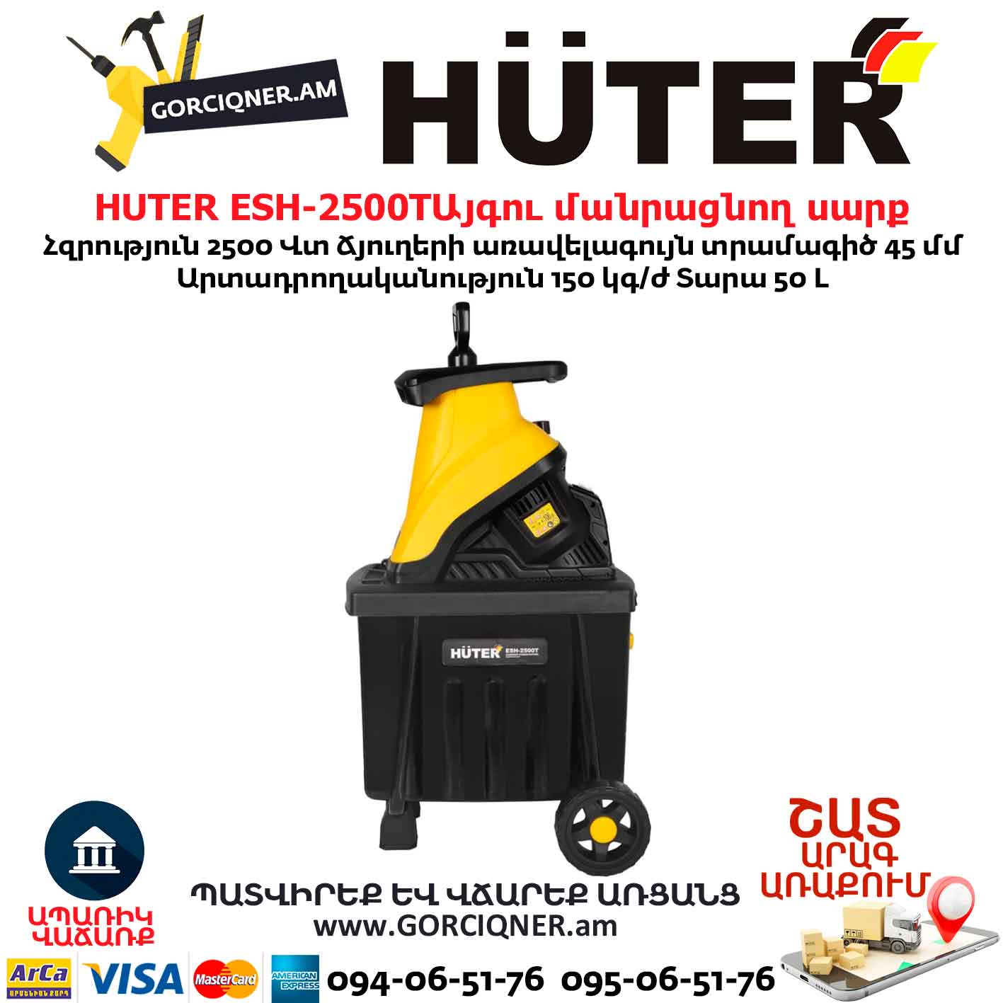 Այգու փայտ մանրացնող էլեկտրական սարք շրեդեր HUTER ESH-2500T