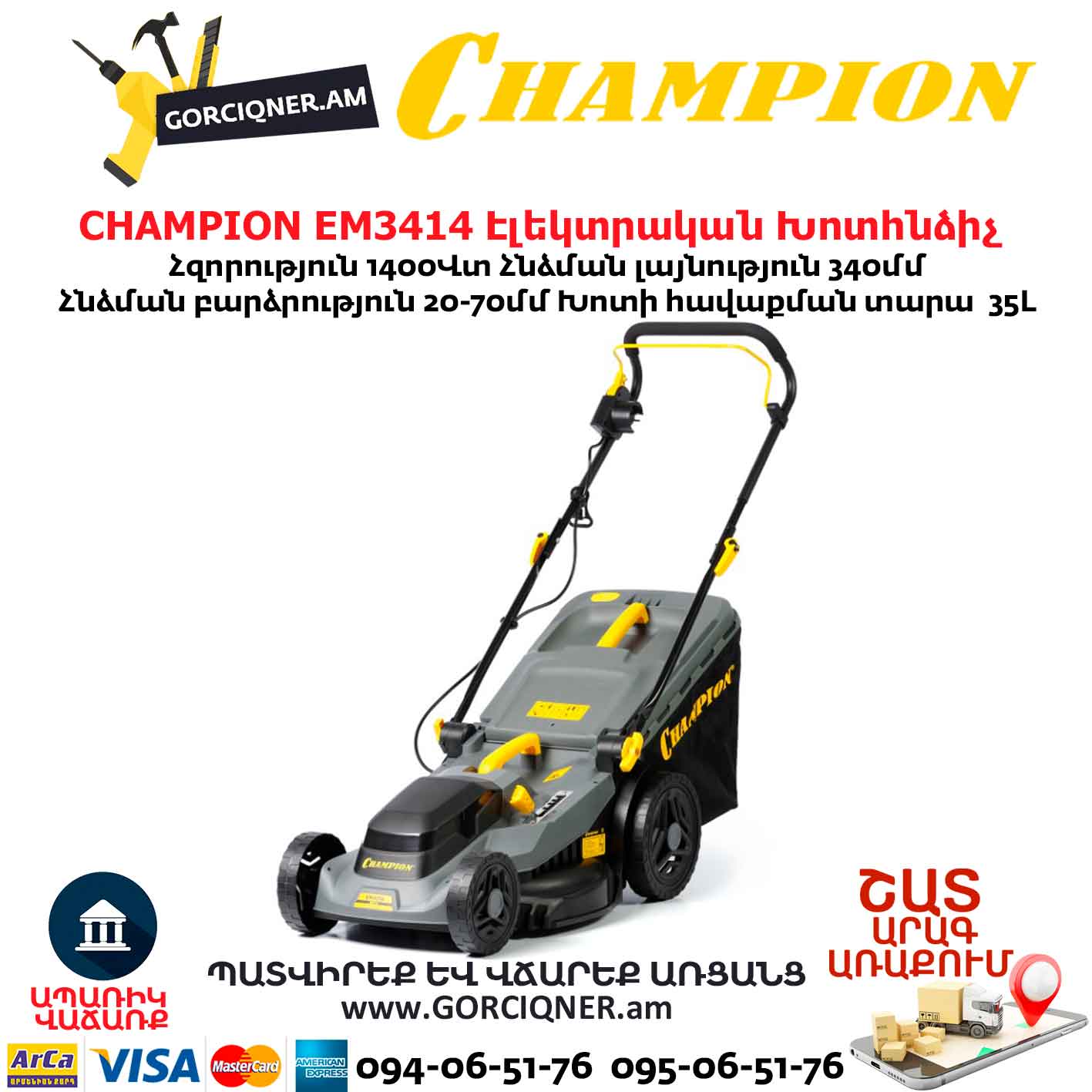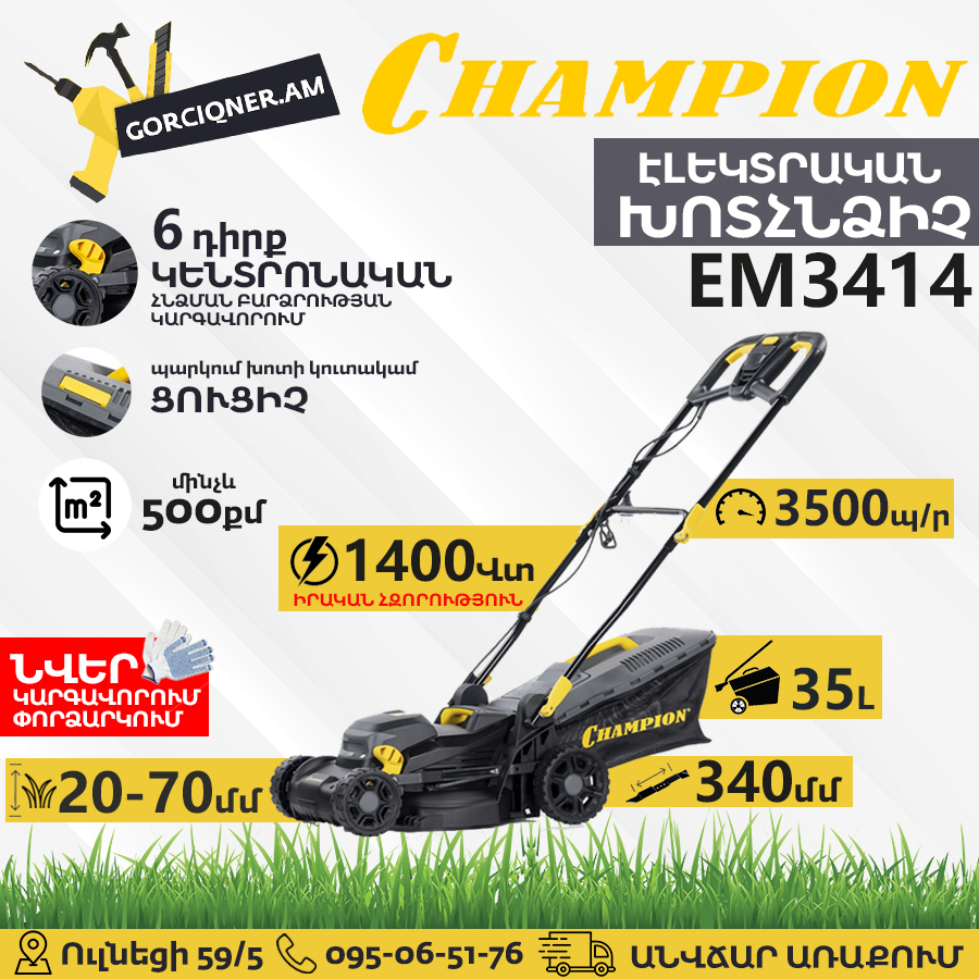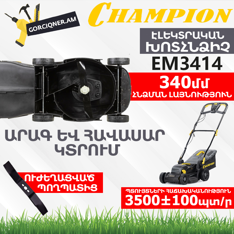 CHAMPION EM3414 էլեկտրական խոտհնձիչը թեթև և կոմպակտ մոդել է՝ 34 սմ կտրման լայնությամբ և 20-ից 70 մմ կարգավորվող բարձրությամբ: Այն ունի 1400 Վտ հզորությամբ շարժիչ, 35 լիտր ծավալով խոտհավաք և մոտ 13 կգ քաշ՝ հավաքիչի հետ միասին: Այն հիանալի ընտրություն է մարգագետինների խնամքի համար՝ իր հեշտ շահագործման և ամուր կառուցվածքի շնորհիվ: