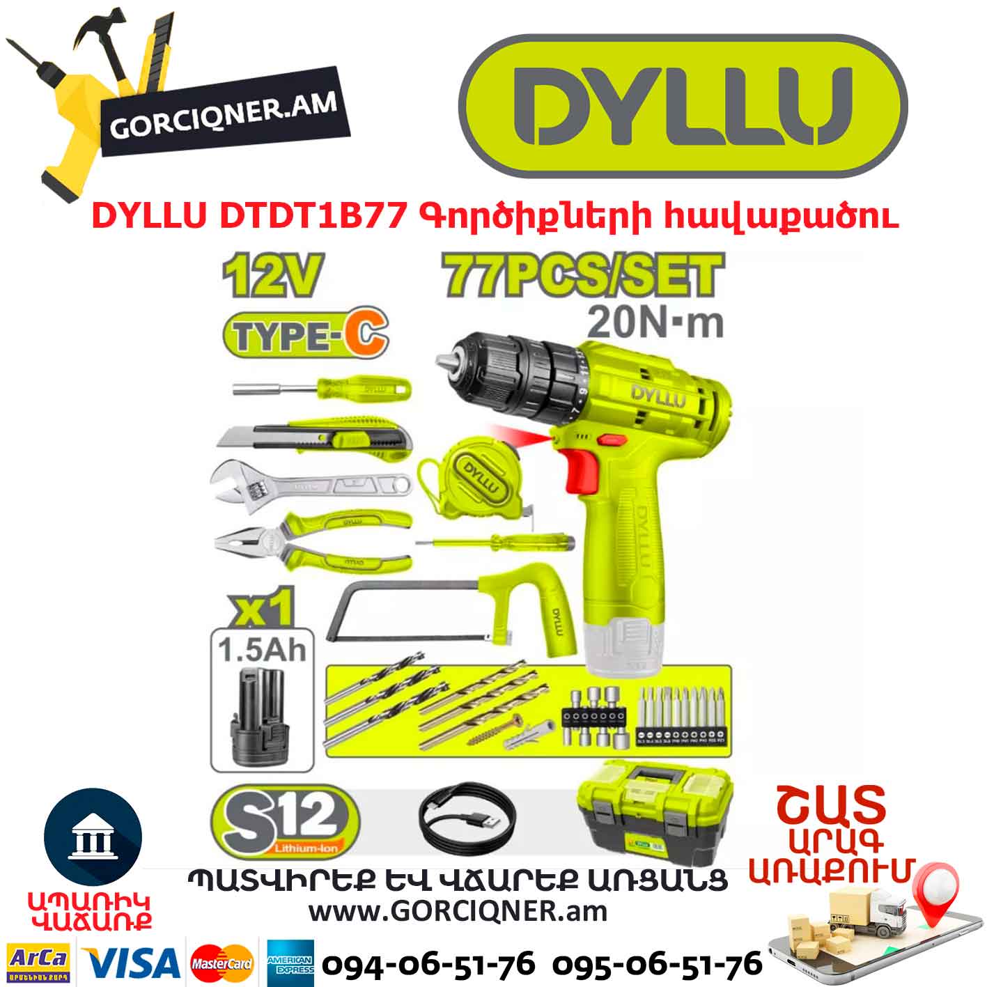 Մարտկոցով պտուտակադարձիչ + գործիքների հավաքածու DYLLU DTDT1B77 77կտ.
