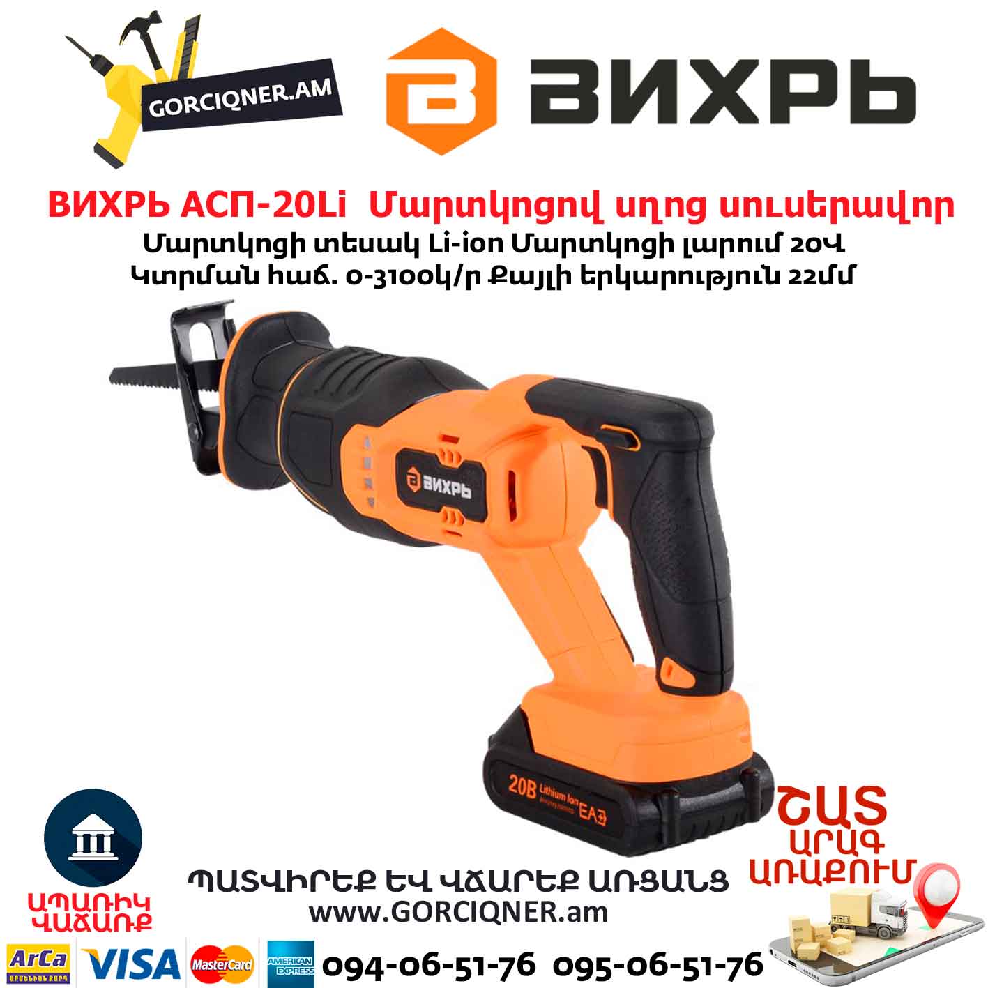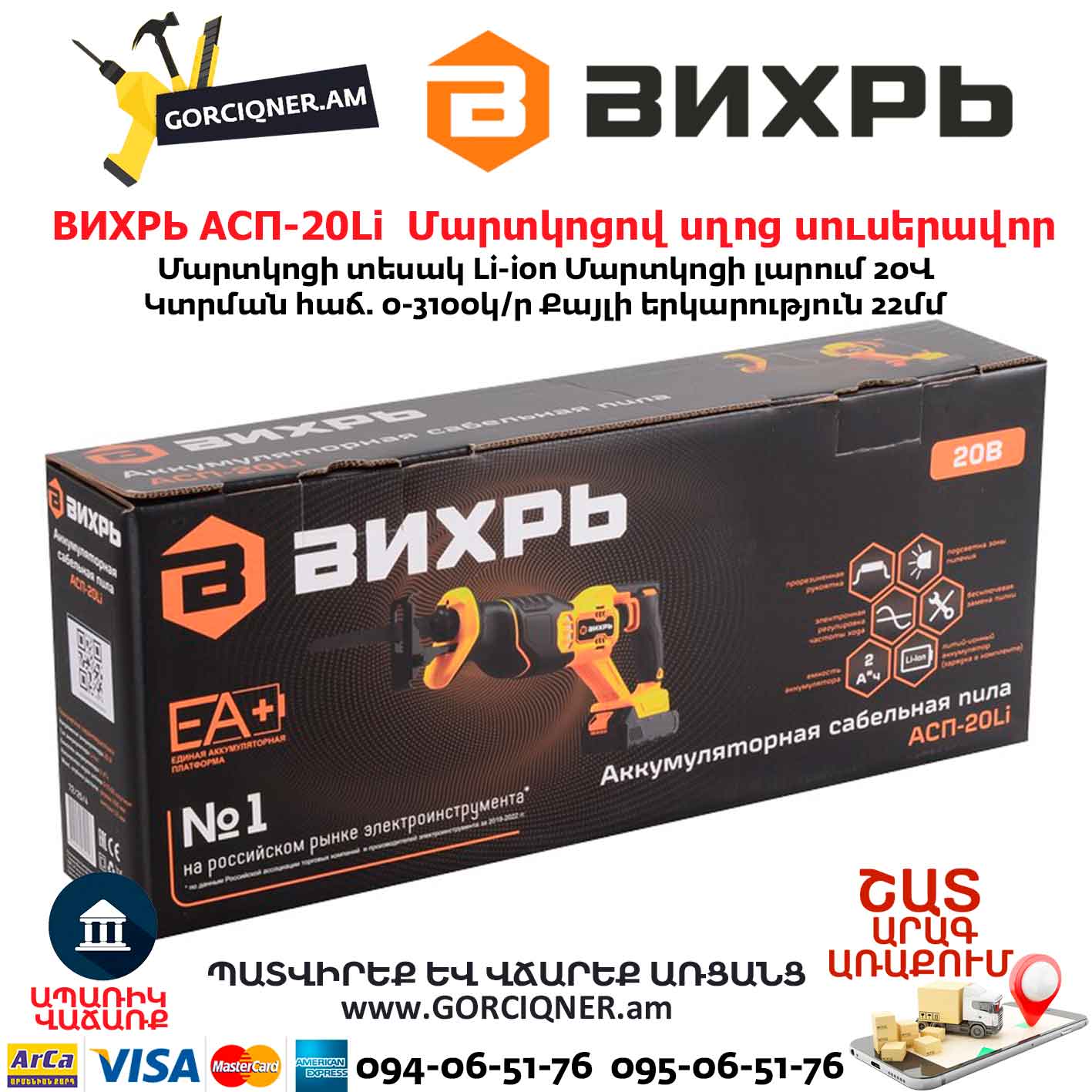 Մարտկոցով սղոց սուսերավոր ВИХРЬ АСП-20Li