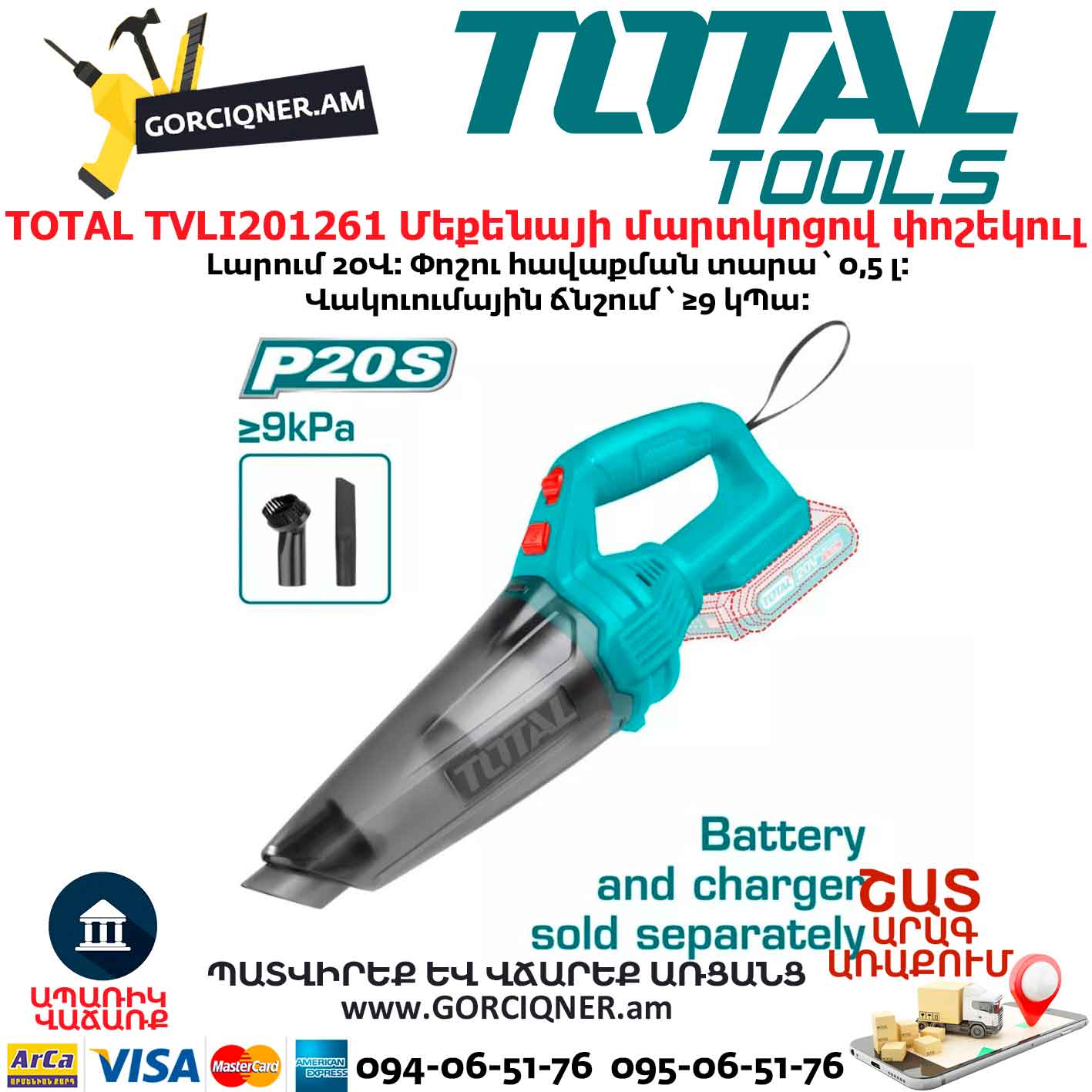 Մեքենայի մարտկոցով փոշեկուլ TOTAL TVLI201261