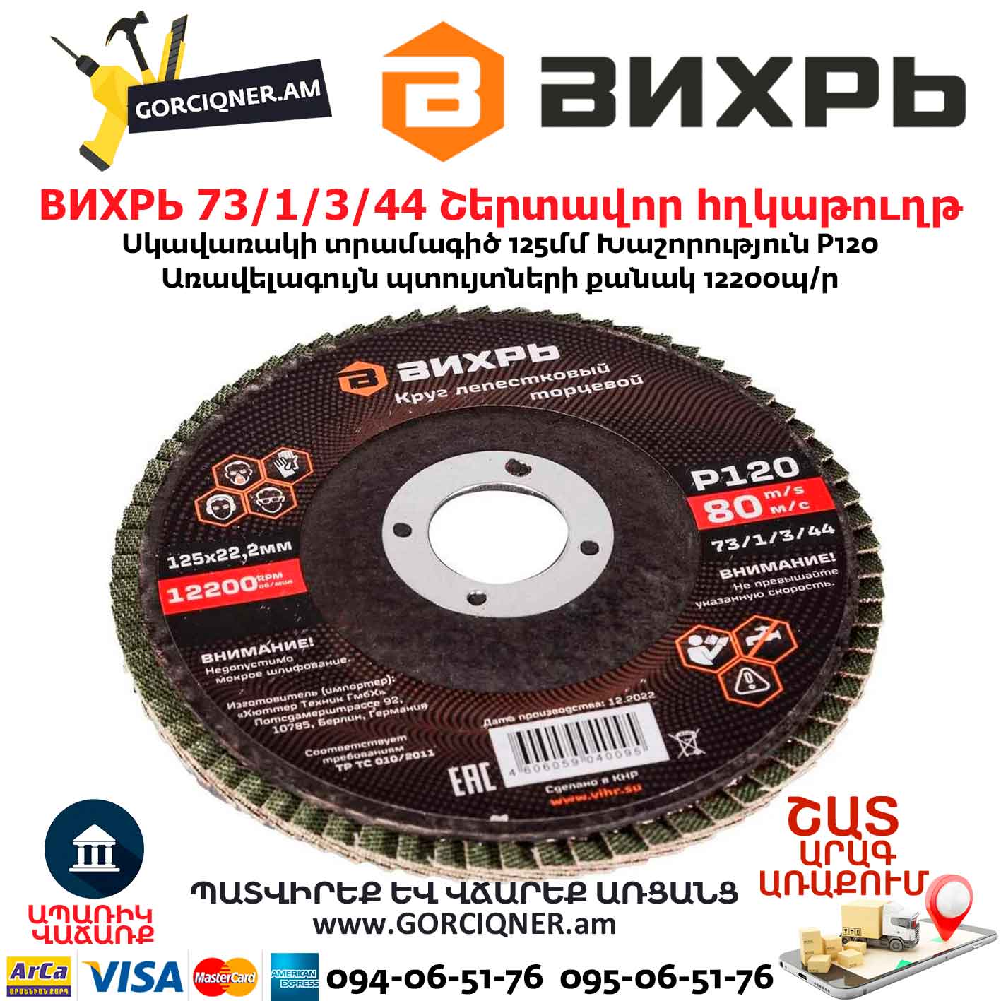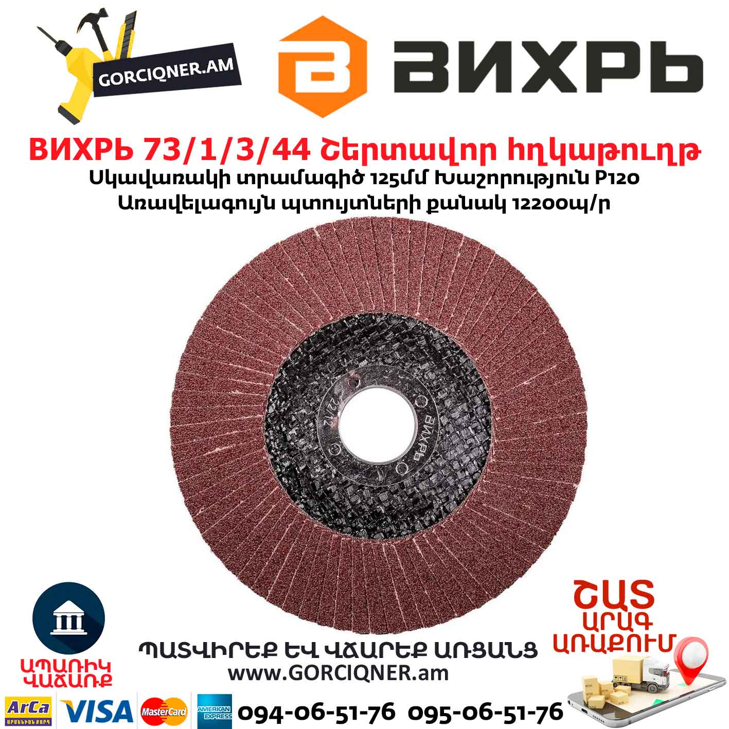 Շերտավոր հղկաթուղթ ВИХРЬ 73/1/3/44 125×22.2 մմ Р120