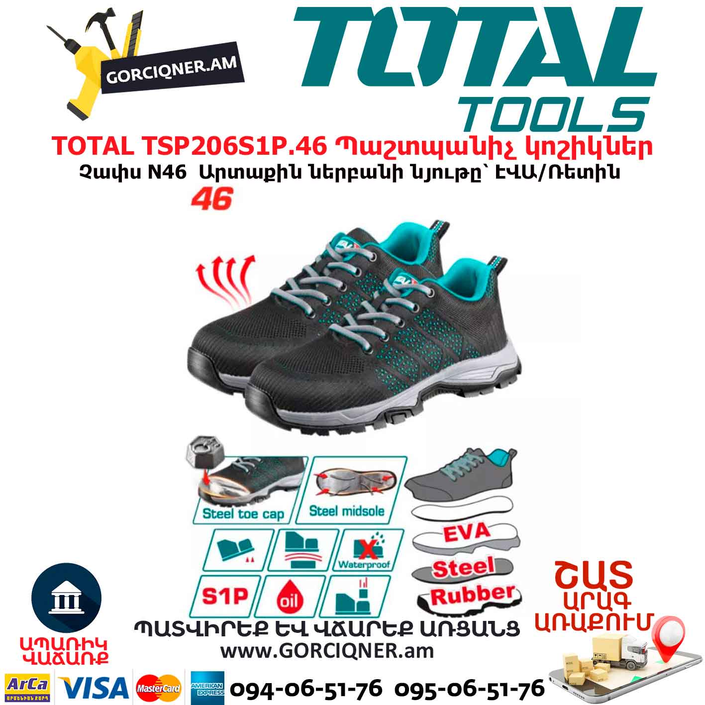 Անվտանգության դաս՝ S1P (պողպատե մատի գլխիկ + պողպատե միջնամաս + հակաստատիկ + հակաթրթռումային)