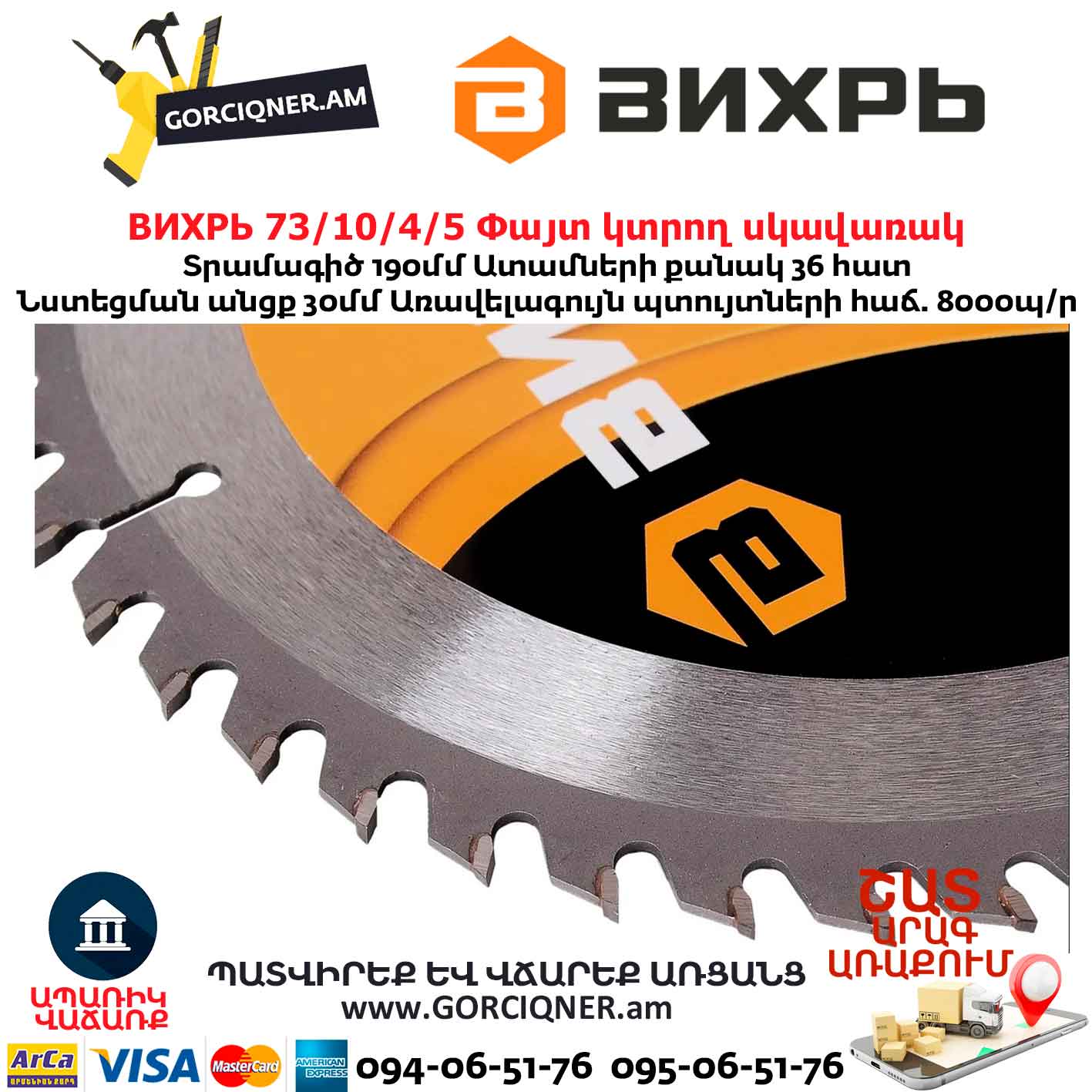 Փայտ կտրող սկավառակ ВИХРЬ 73/10/4/5 190×30մմ 36ատամ