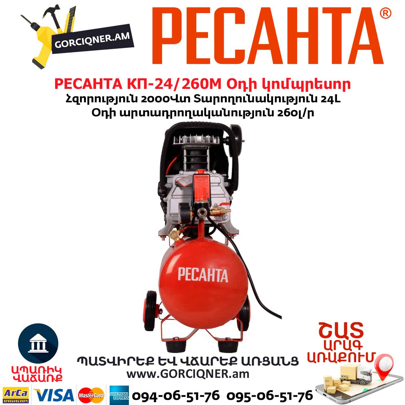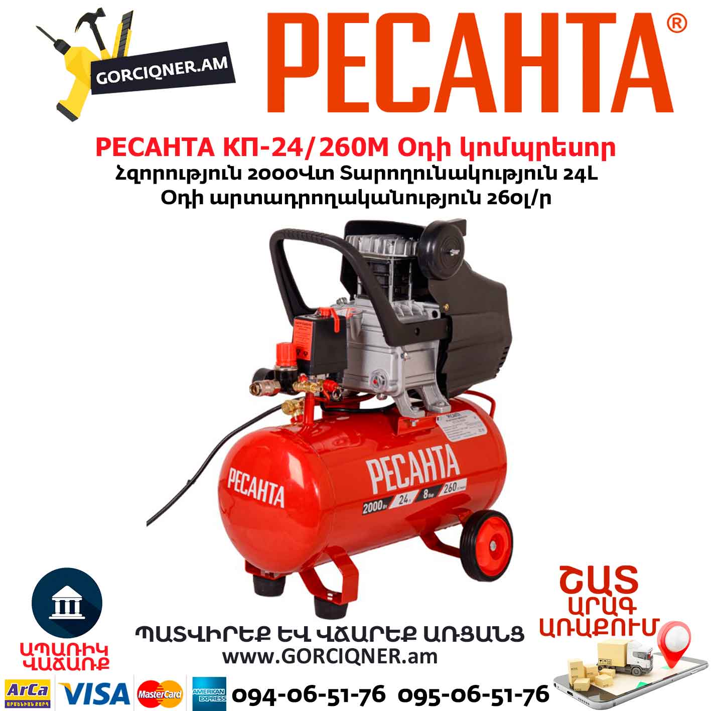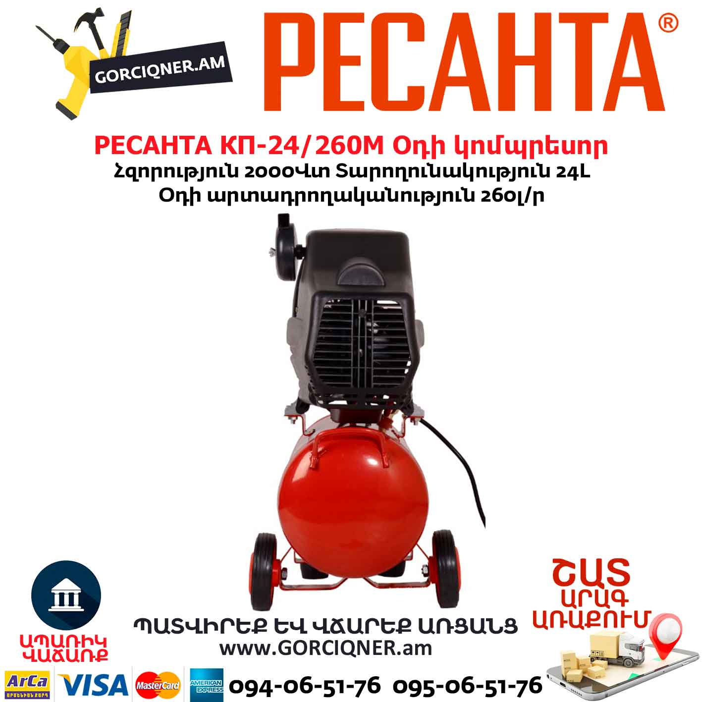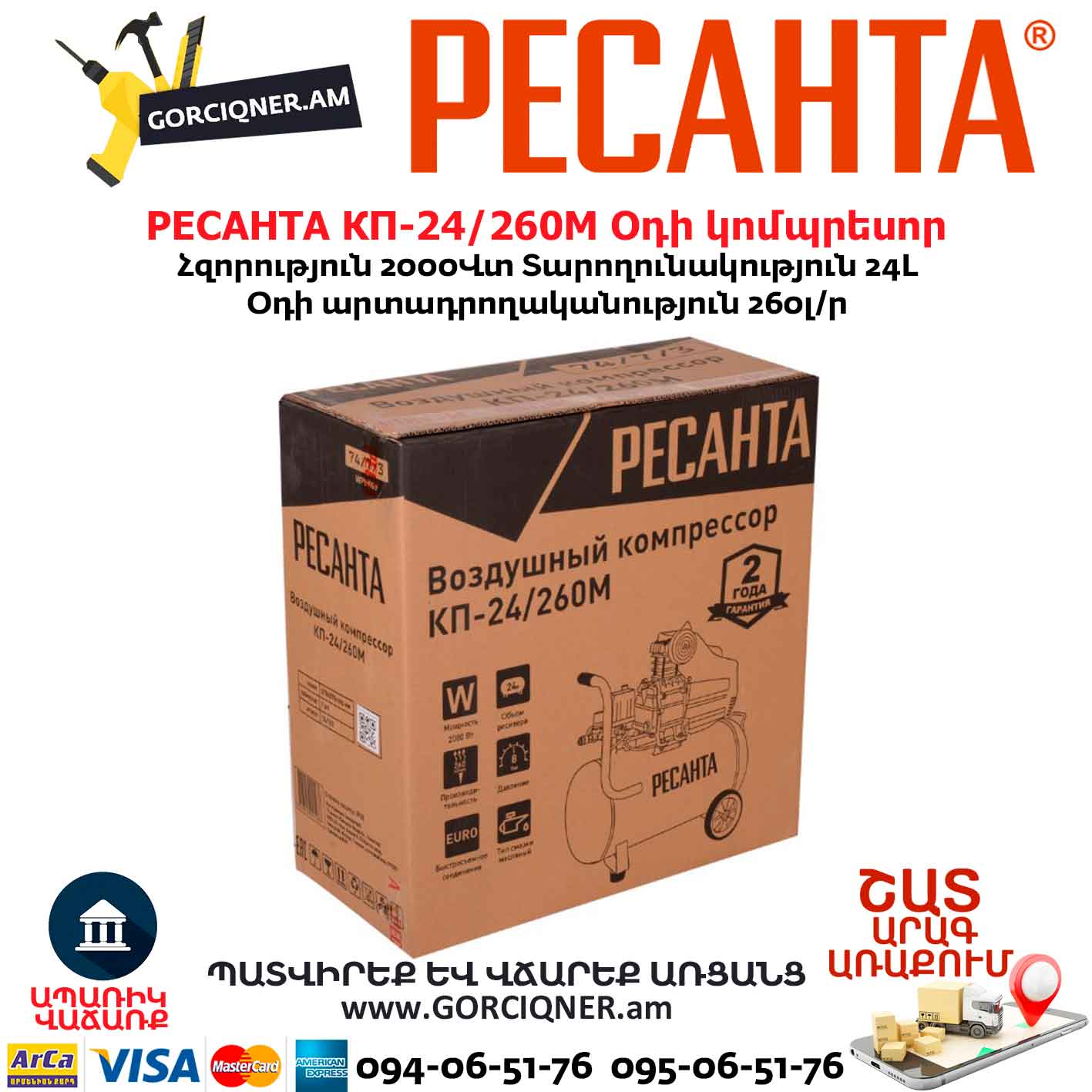 Օդի կոմպրեսոր РЕСАНТА КП-24/260М 24Լ/2000Վտ