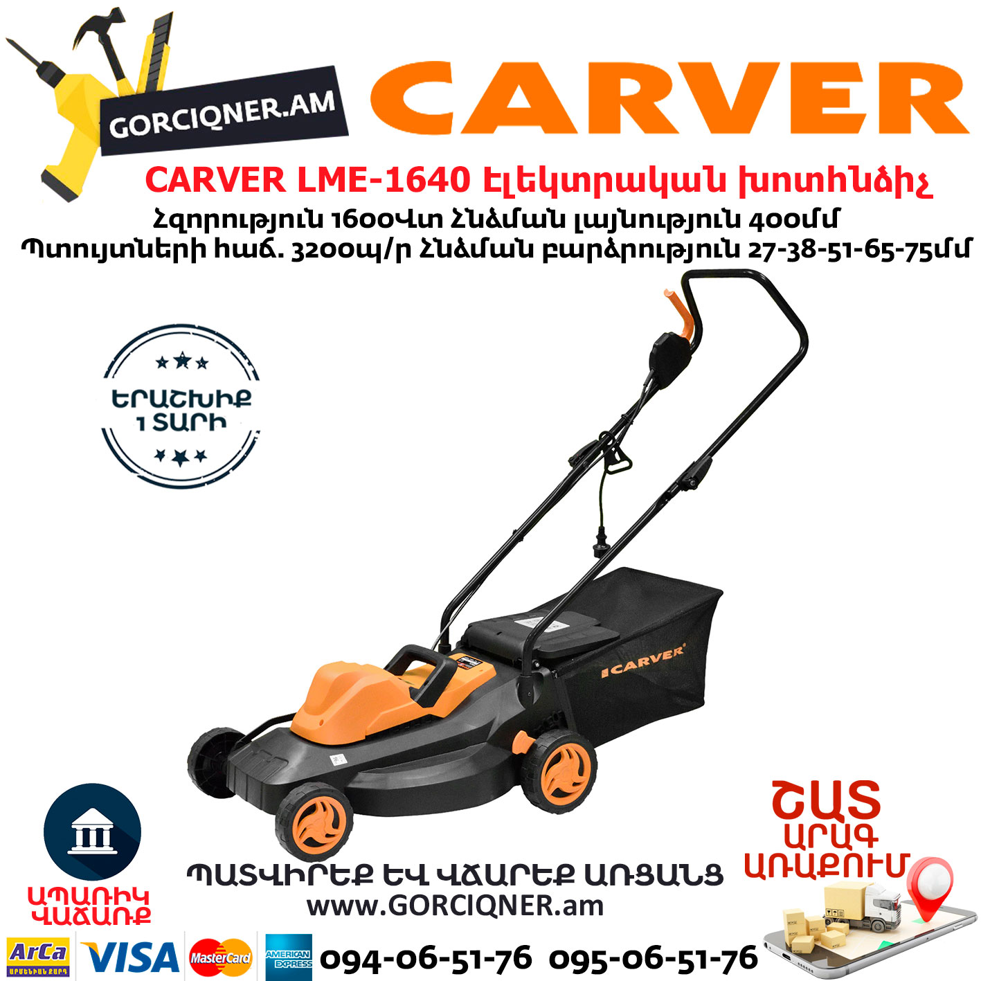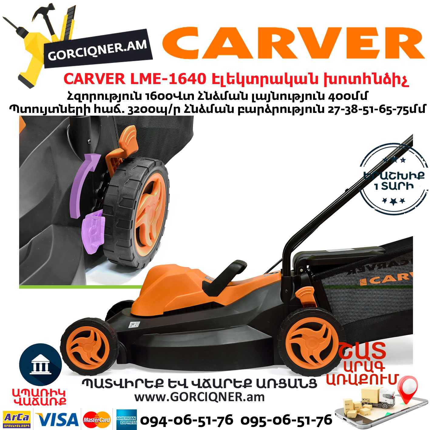 CARVER LME-1640 Էլեկտրական անիվներով խոտհնձիչ