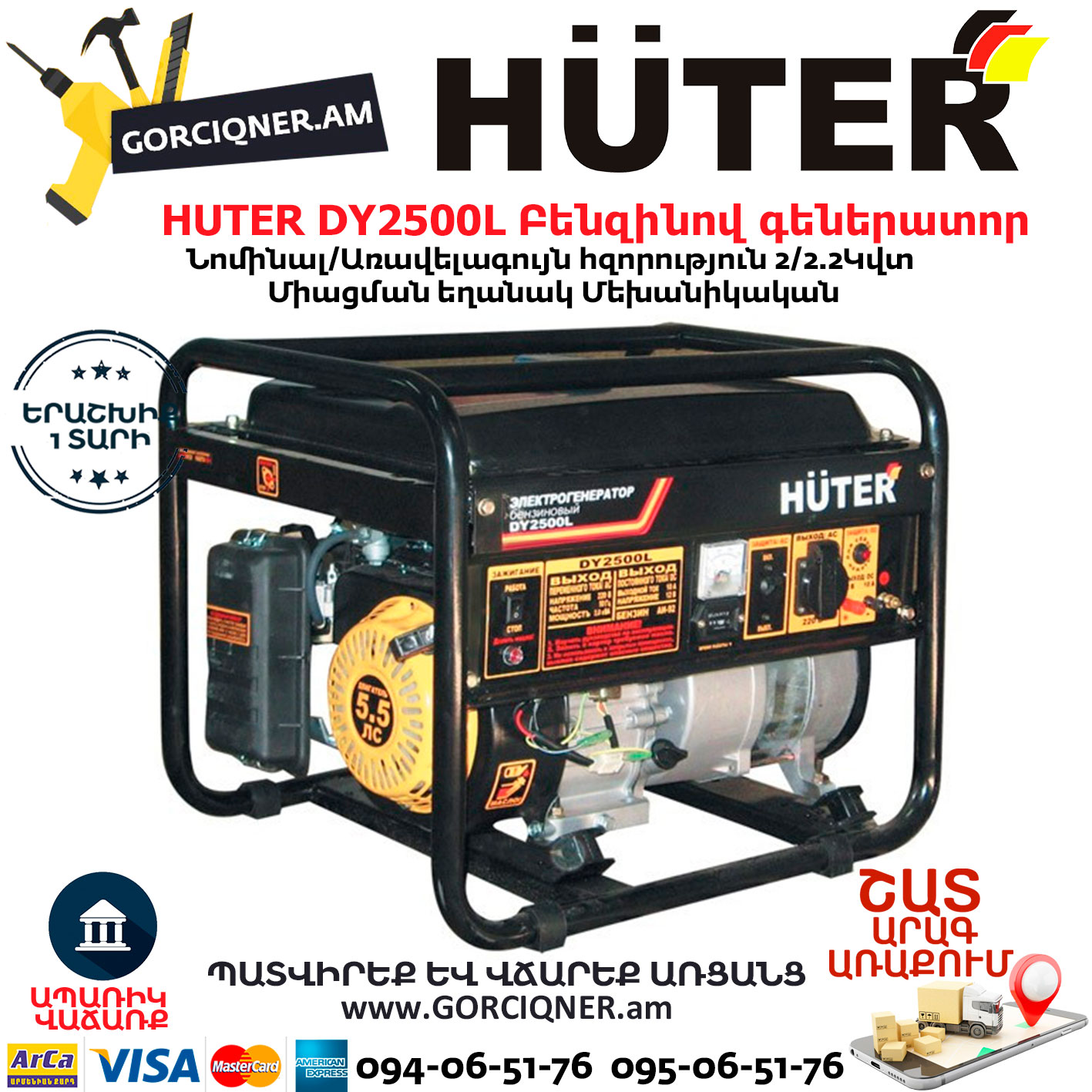 HUTER DY2500L Բենզինային գեներատոր 2.2կվտ 64/1/3