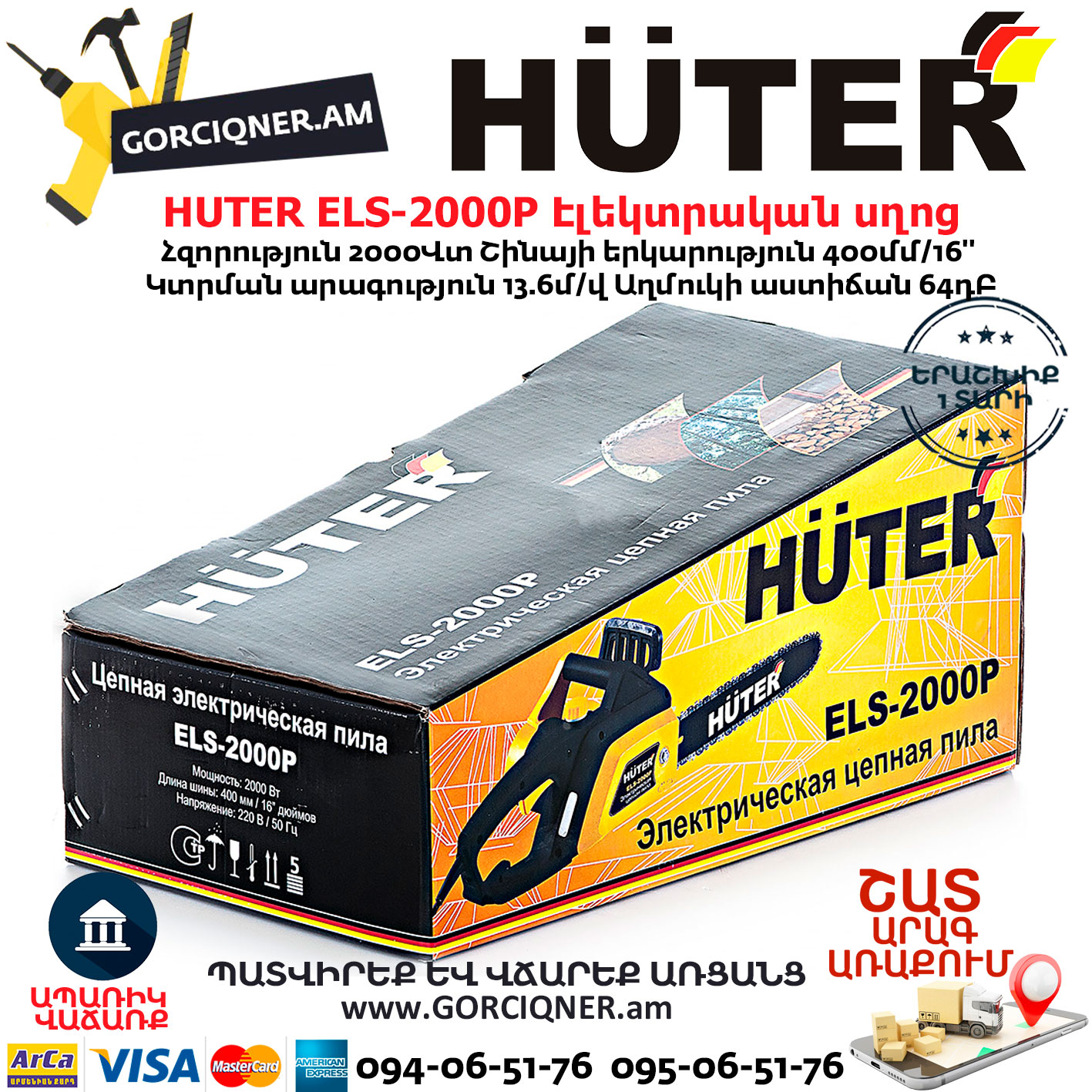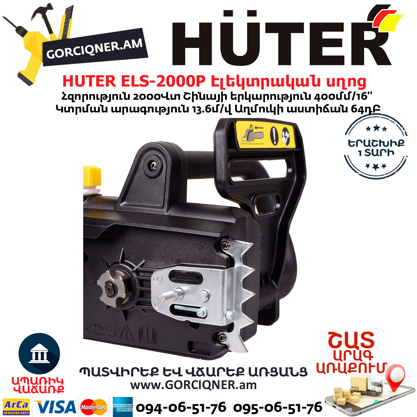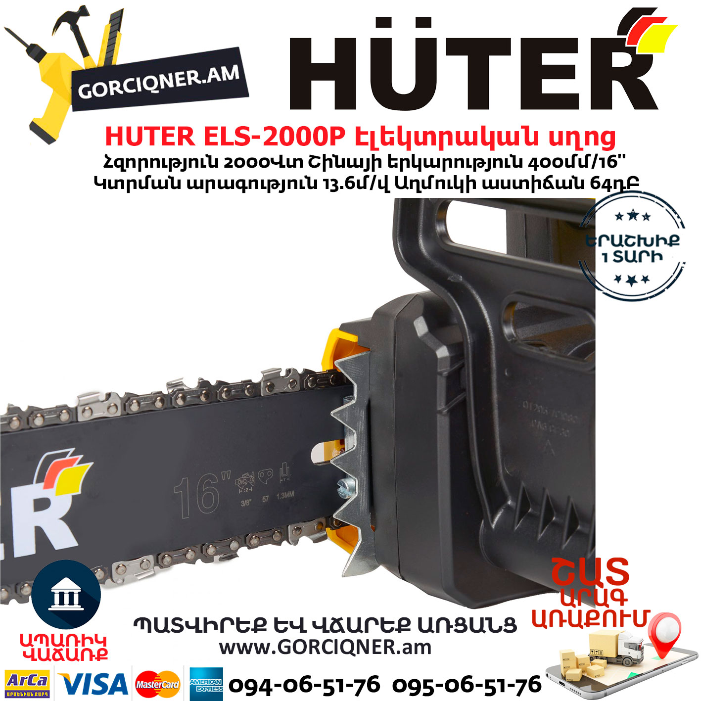 HUTER ELS-2000P Էլեկտրական շղթայավոր սղոց 400մմ/2000Վտ 70/10/3