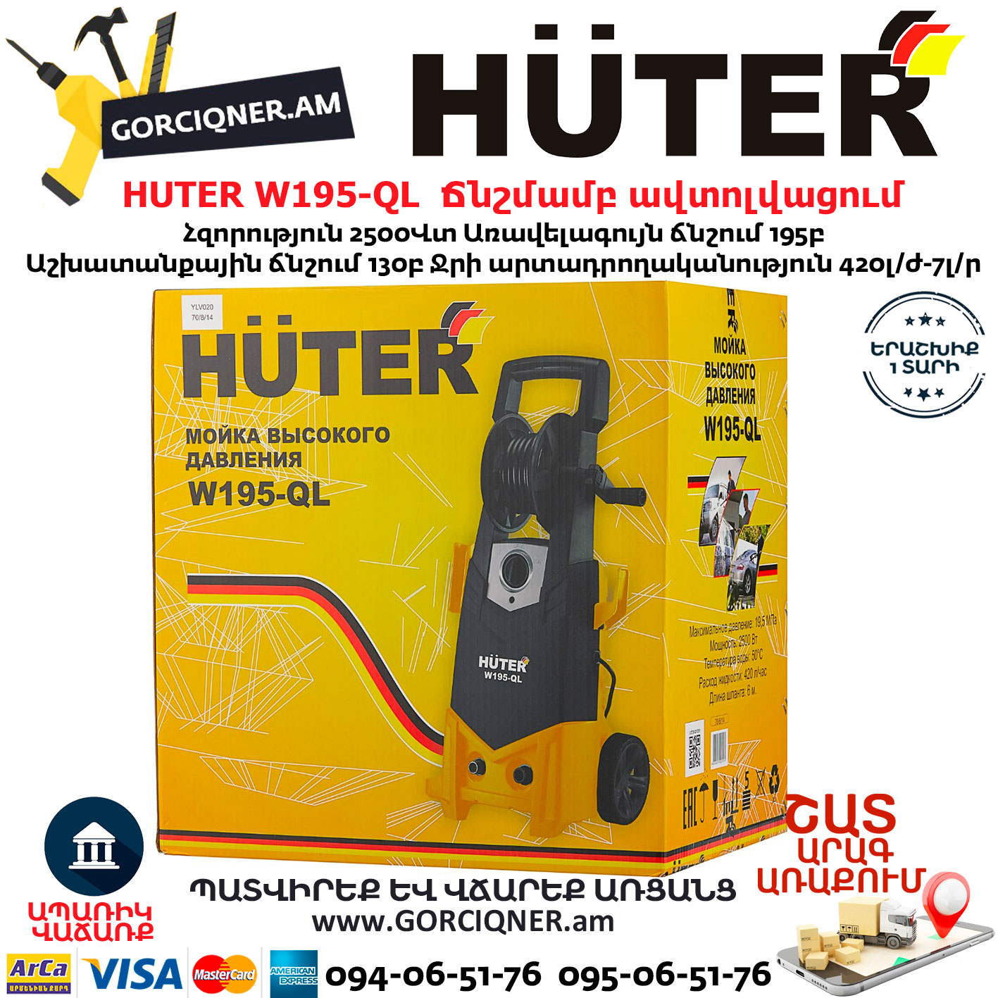 HUTER W195-QL Բարձր ճնշմամբ ավտոլվացում 195բ/2500վտ 70/8/14