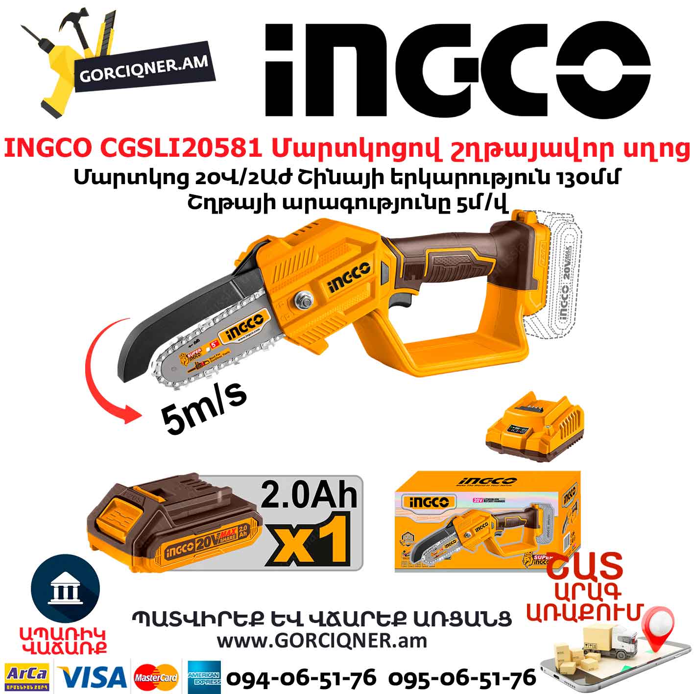 INGCO CGSLI20581 Մարտկոցով շղթայավոր սղոց 130մմ/20Վ/2Աժ