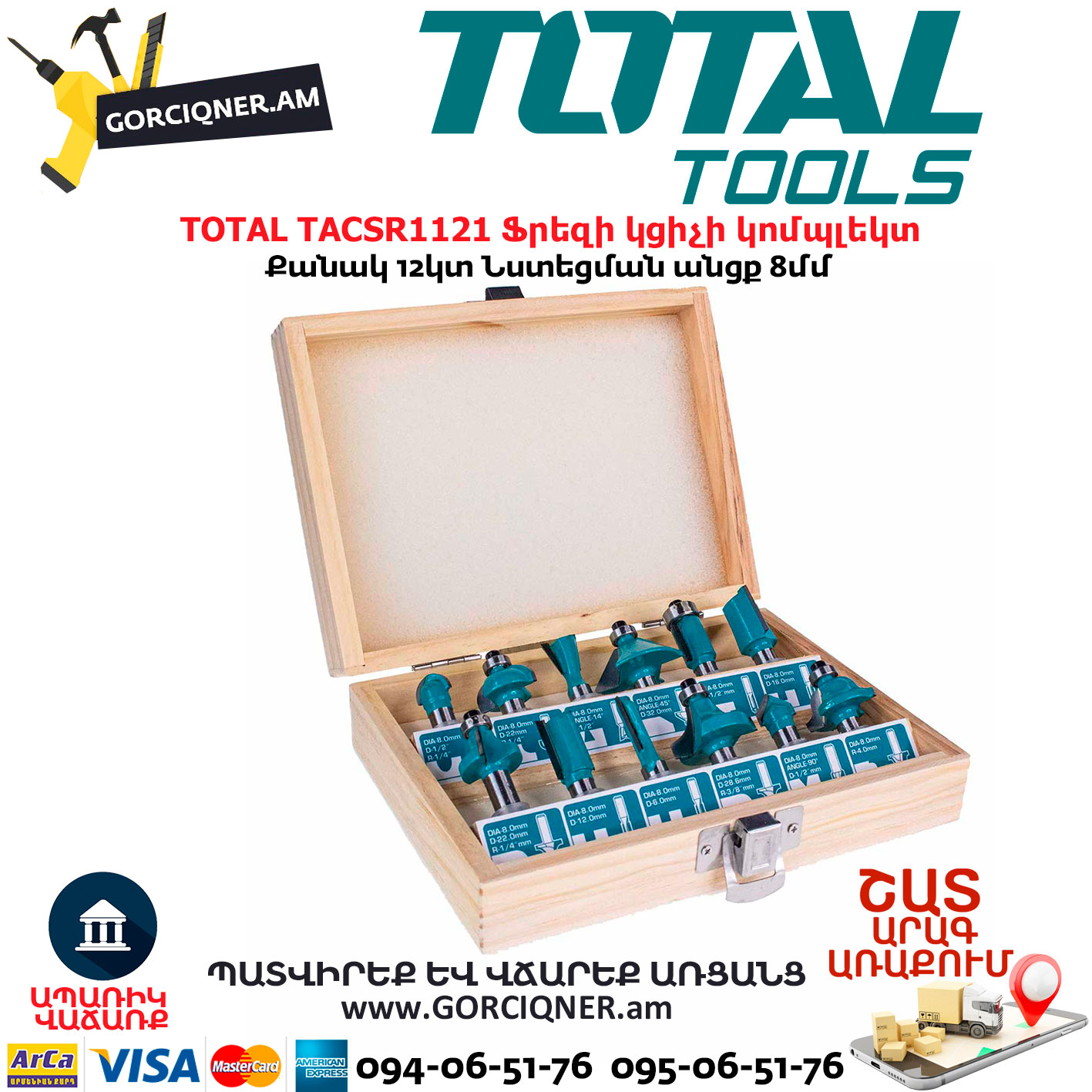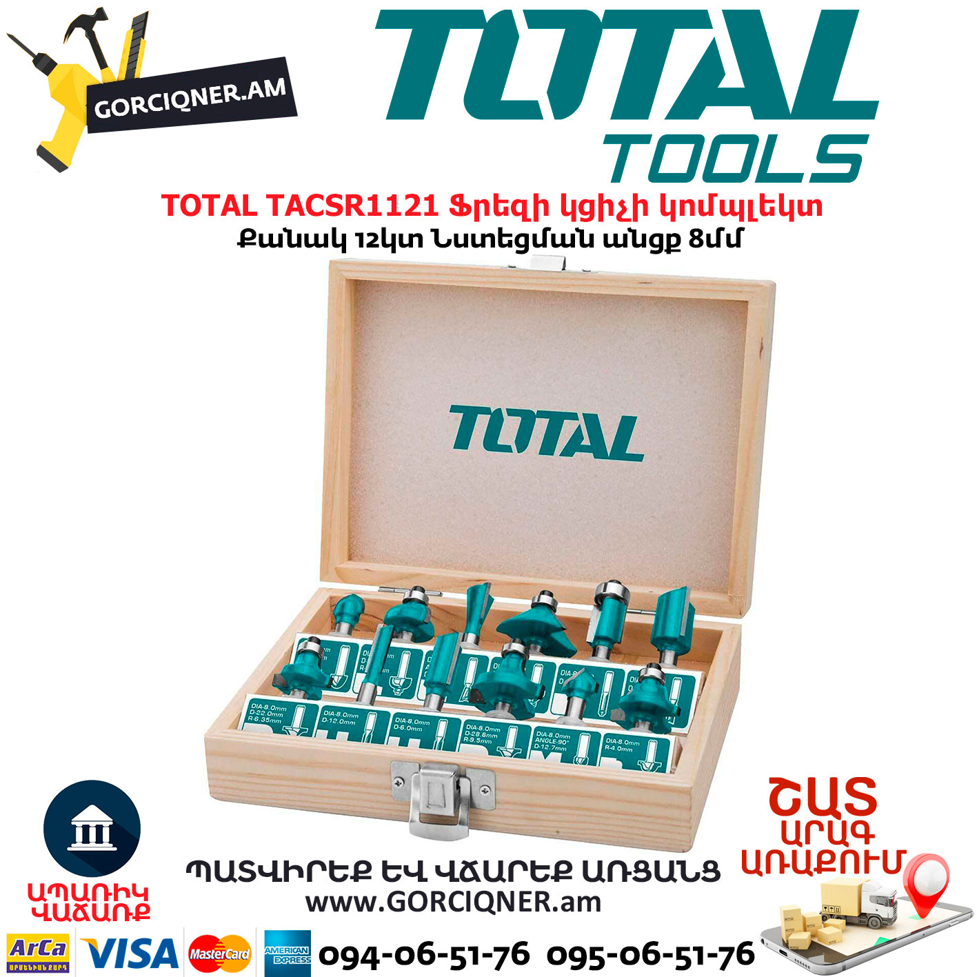 TOTAL TACSR1121 – հավաքածուն նախատեսված է դեկորատիվ վերամշակման համար , երբ փափուկ և կոշտ փայտից կտրվում և մշակվում են փայտի կտորները : Գործիքի օգնությամբ ձեռք է բերվում բարձրորակ և արդյունավետ մակերեսային ավարտ : Հավաքածուն պարունակում է անցքային գործիքներ , պրոֆիլային գործիքներ , եզրային գործիքներ և այլն :