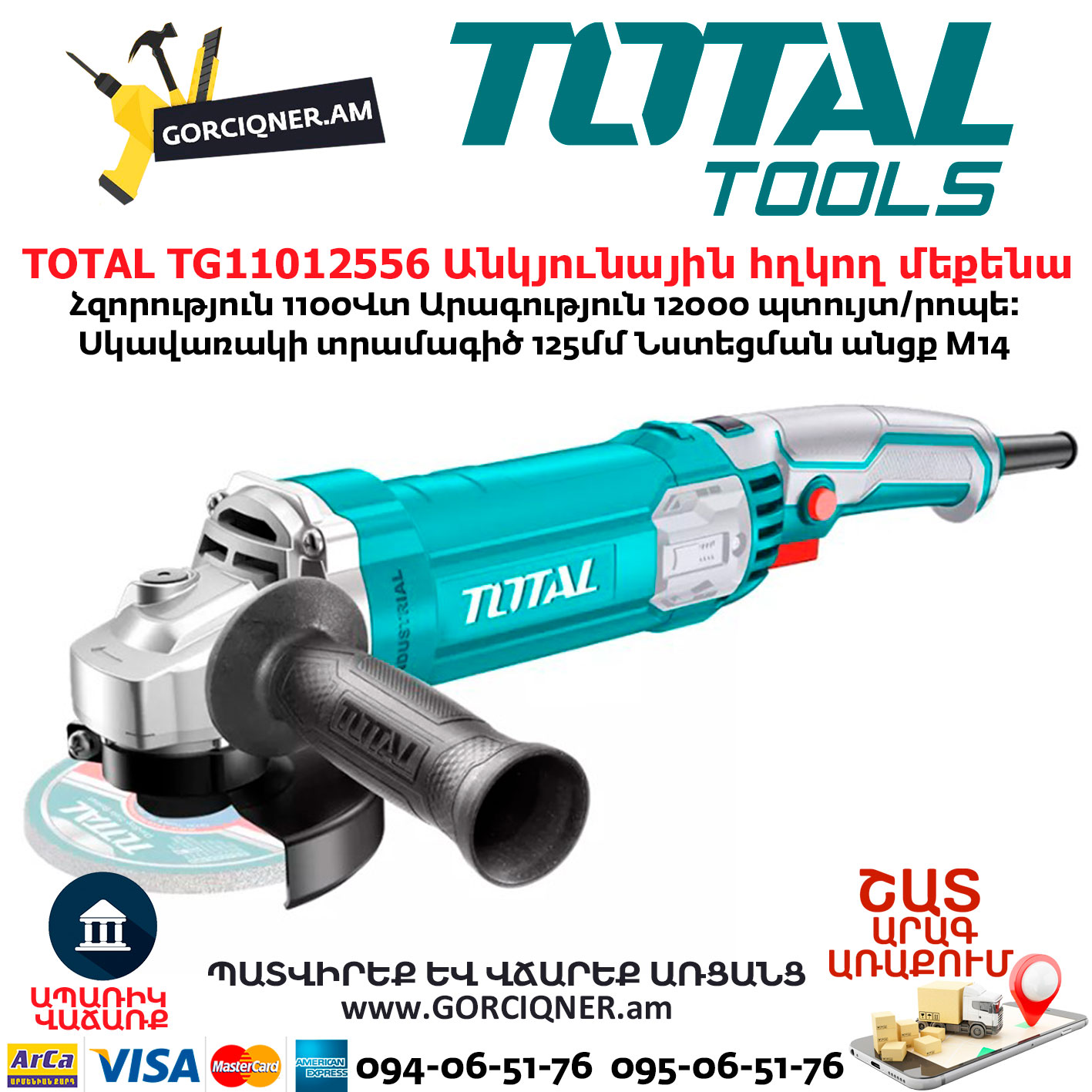 TG11012556 անկյունային հղկող մեքենան անփոխարինելի գործիք է բազում շինարարական աշխատանքների համար: Բարձր պտույտների դեմ պաշտպանությունը ապահովում է գործիքի հուսալի ու երկարատև աշխատանքը: Հավաքածուն ներառում է ռետինե բռնակ՝ հարմարավետ աշխատելու համար: