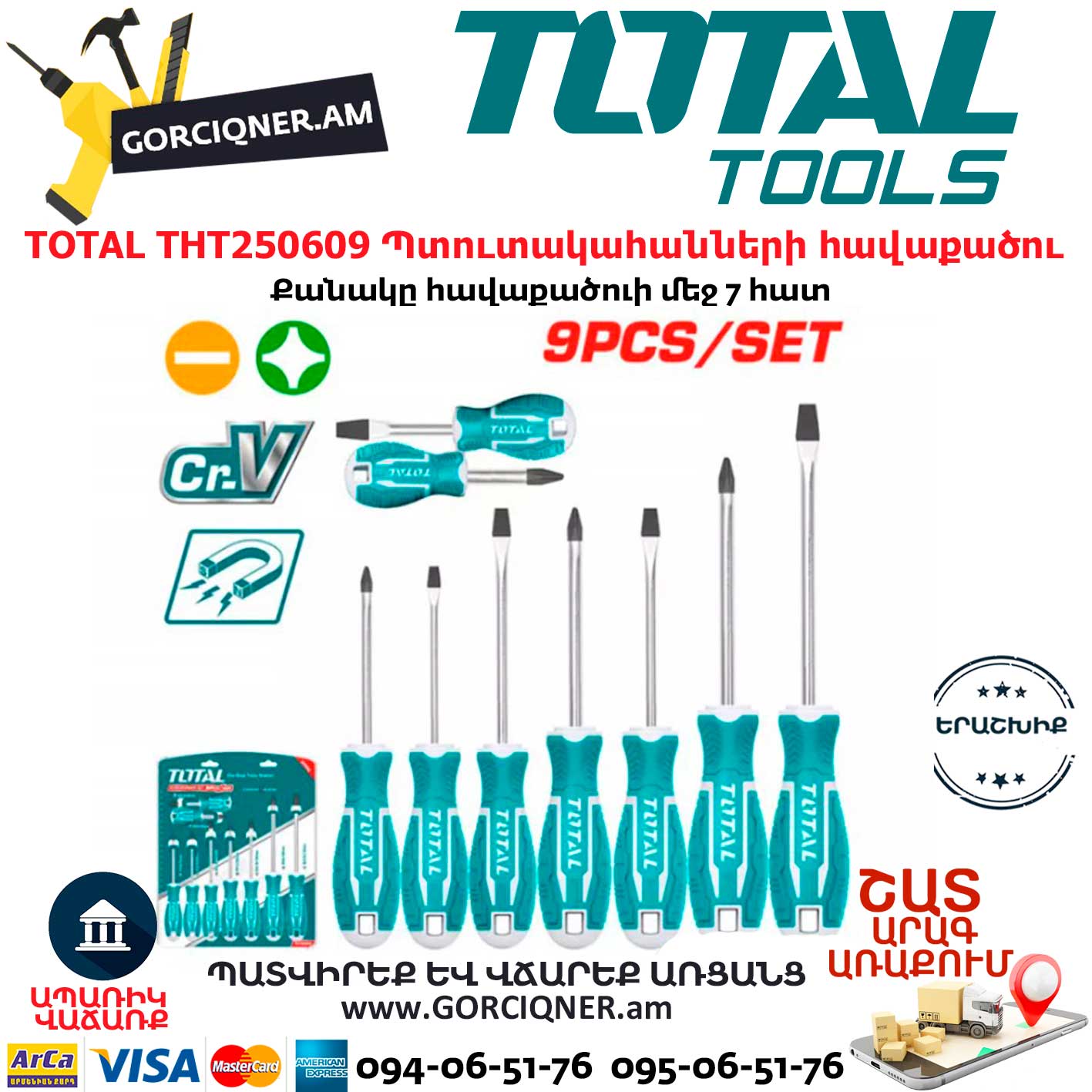 Ձողի նյութը ՝ Cr – V : TOTAL THT250609 – ը օգտագործվում է ուղիղ և խաչաձև խոռոչների հետ աշխատելու համար : Հավաքածուն բաղկացած է անհրաժեշտ չափերի պտուտակահաններից ՝ կախելու համար անցքերով : 5 պտուտակահաններն ունեն ուղիղ անցք , 4 – ը ՝ խաչաձև : Քրոմ վանադիումի պողպատը , որից պատրաստված են գործիքի ձողերը , ունեն ավելի երկար ծառայության ժամկետ , չեն վախենում կոռոզիայից և դեֆորմացիայից : Բռնակները պատրաստված են պոլիմերային նյութերից, հակասայթաքուն հատկություններով , ինչը ապահովվում է պտուտակահանների օգտագործման հարմարավետությունը :