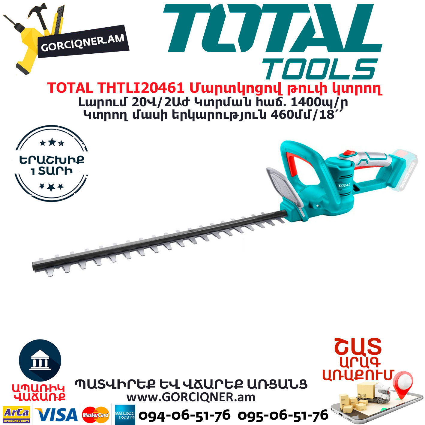 TOTAL THTLI20461 Մարտկոցով թուփ կտրող TOTAL ARMENIA ԱՅԳՈՒ ՄԱՐՏԿՈՑՈՎ ԳՈՐԾԻՔՆԵՐ