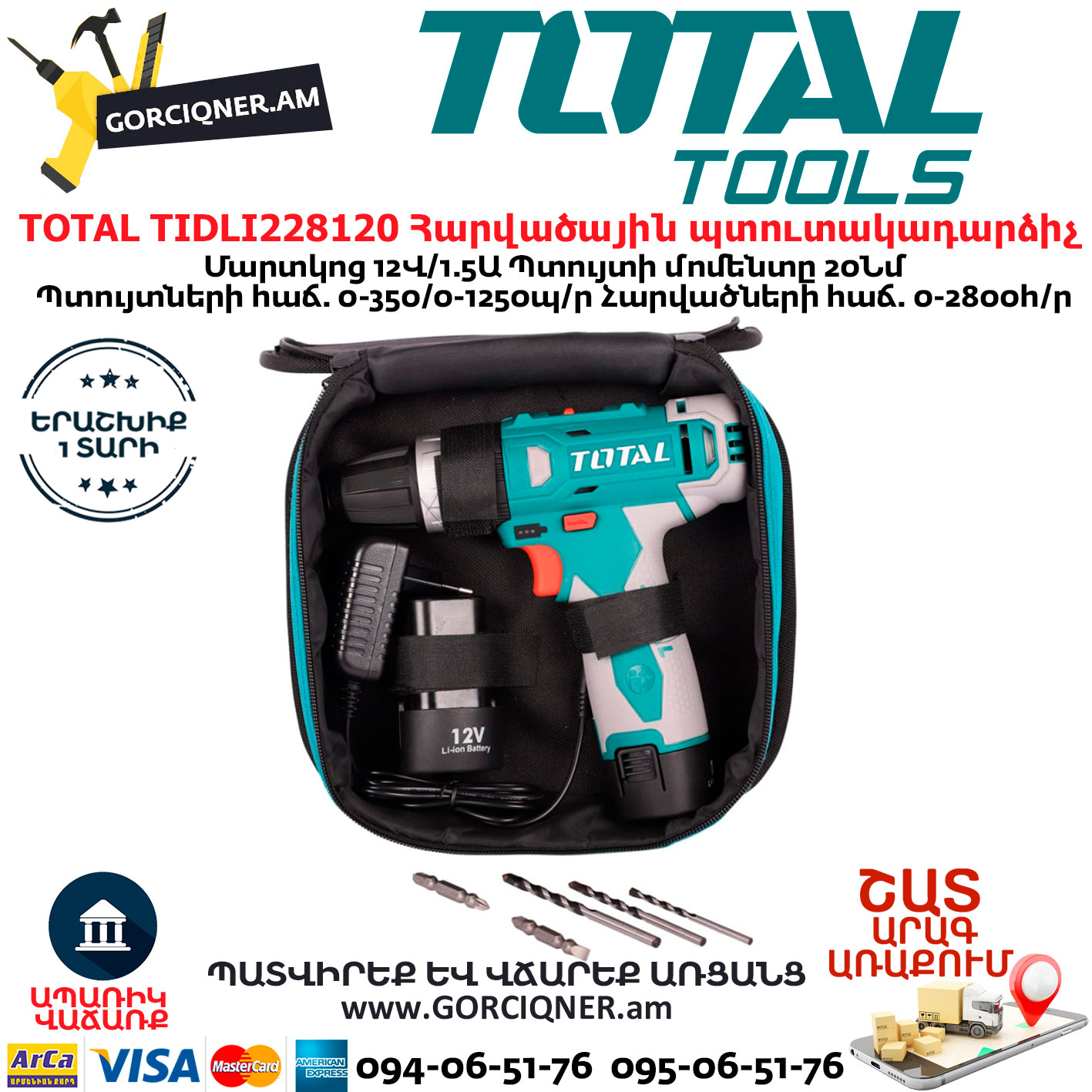 TOTAL TIDLI228120 Հարվածային մարտկոցով պտուտակադարձիչ 12Վ