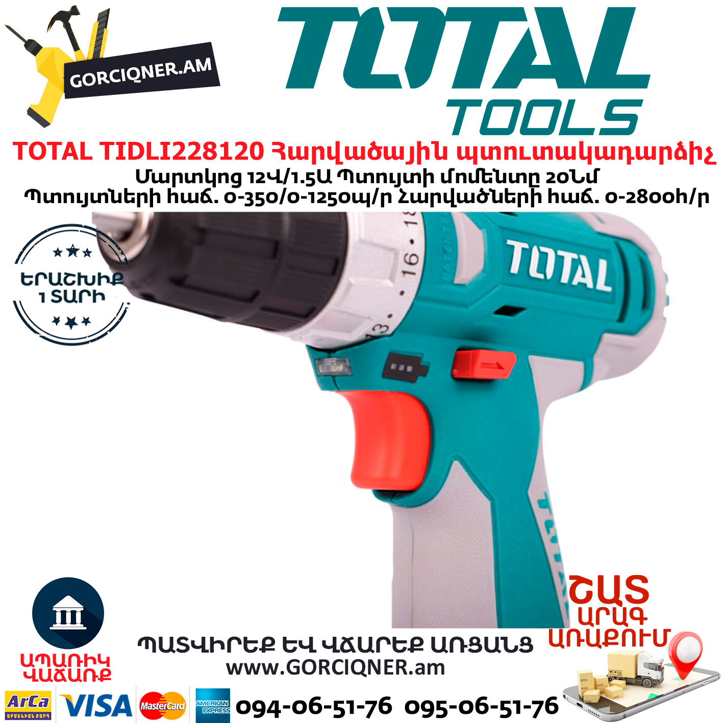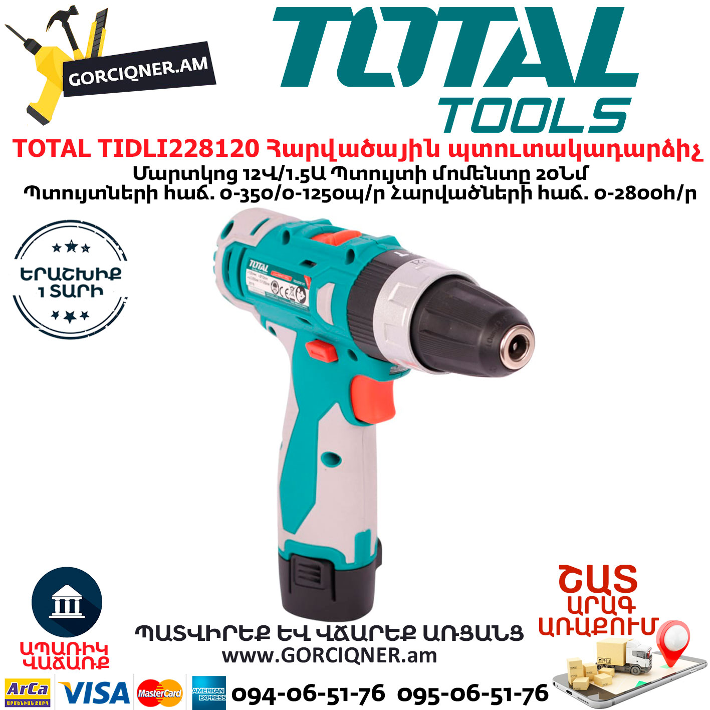 TOTAL TIDLI228120 Հարվածային մարտկոցով պտուտակադարձիչ