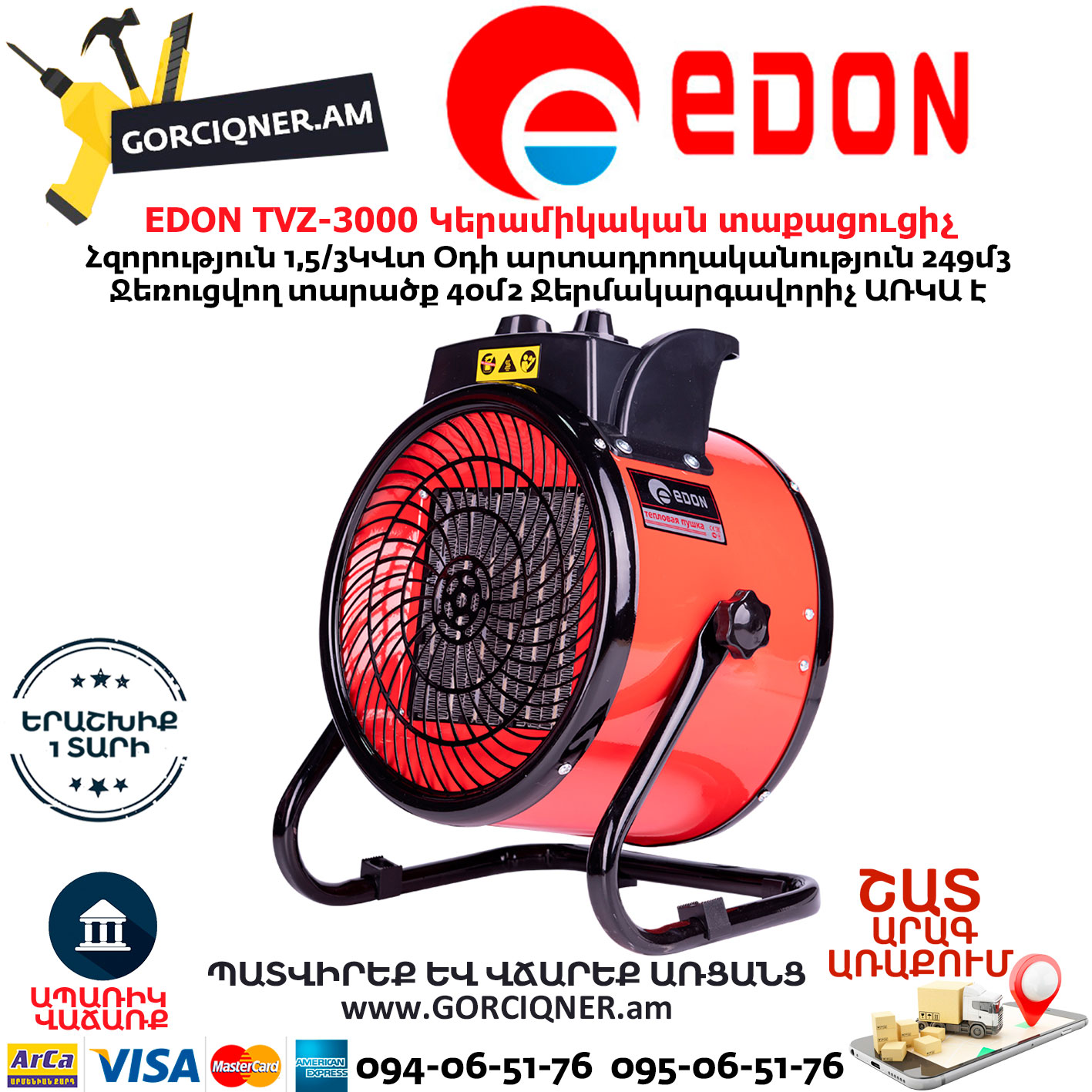 EDON TVZ-3000 Կերամիկական Էլեկտրական տաքացուցիչ 1,5/3կվտ