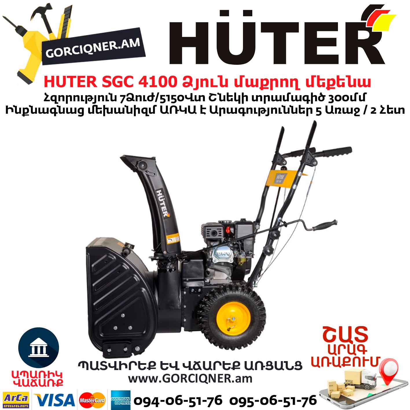 Уборка снега на приусадебном участке будет занимать минимум времени и сил, если приобрести снегоуборочную машину с бензиновым приводом HUTER SGC 4100. Снегоуборщик оснащён бензиновым двигателем мощностью 7 л.с. и семью скоростями (5 – вперёд и 2 – назад). Ширина захвата при одном проходе составляет 56 см. А высота захвата составляет 54 см. Высота подъема ковша регулируется металлическими башмаками. Объём топливного бака – 3.6 л.