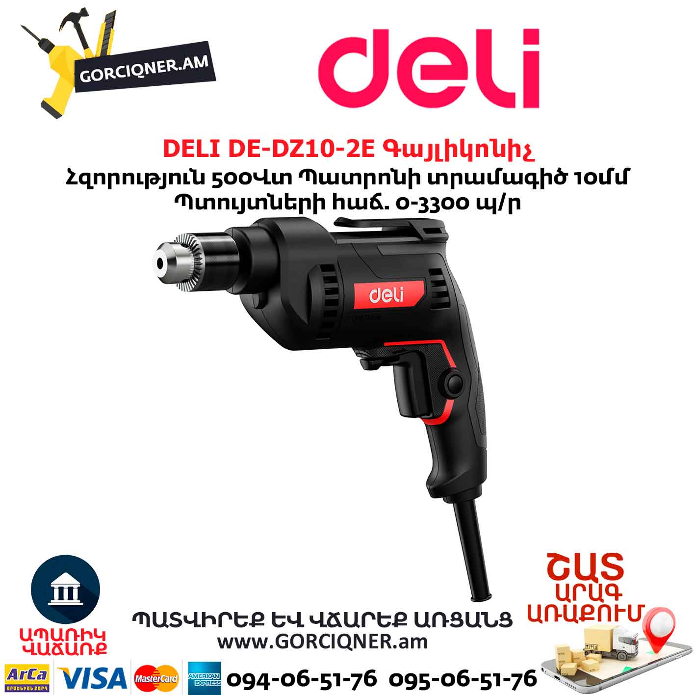 Безударная дрель DELI DE-DZ10-2E 500Вт