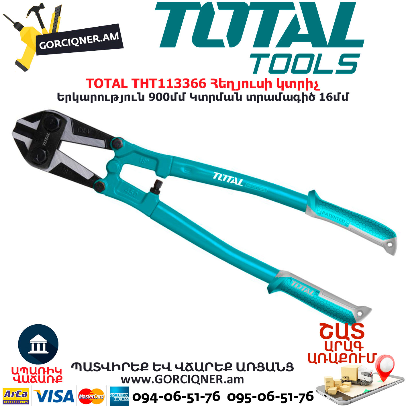TOTAL THT113366 используется для перекусывания болтов, прутков, арматуры. Рабочая часть изделия выполнена из хромванадиевой стали, благодаря чему устойчива к деформации и коррозии. Рукоятки выполнены из полимерных материалов для комфортного выполнения работ и отсутствия скольжения. Длина болтореза – 900 мм.
