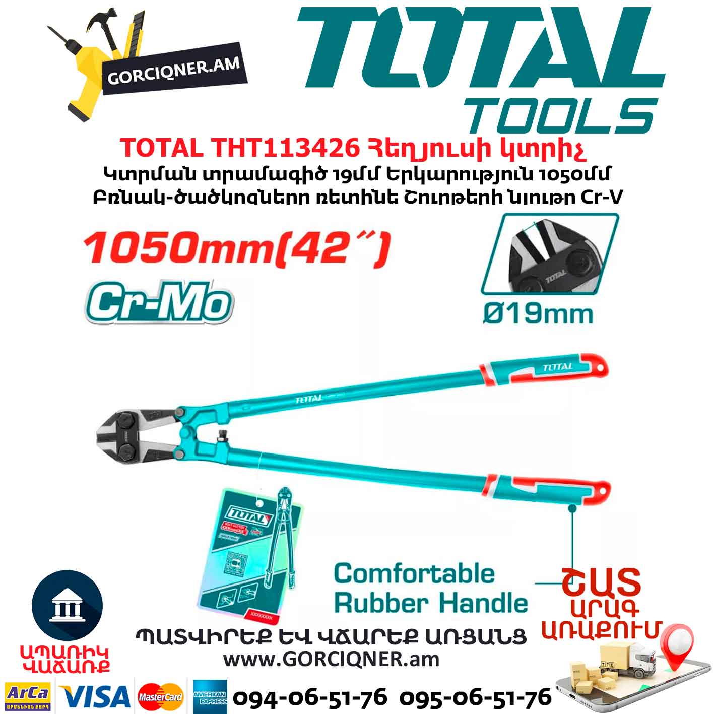 TOTAL THT113426 используется для перекусывания болтов, прутков, арматуры. Рабочая часть изделия выполнена из хромванадиевой стали, благодаря чему устойчива к деформации и коррозии. Рукоятки выполнены из полимерных материалов для комфортного выполнения работ и отсутствия скольжения.