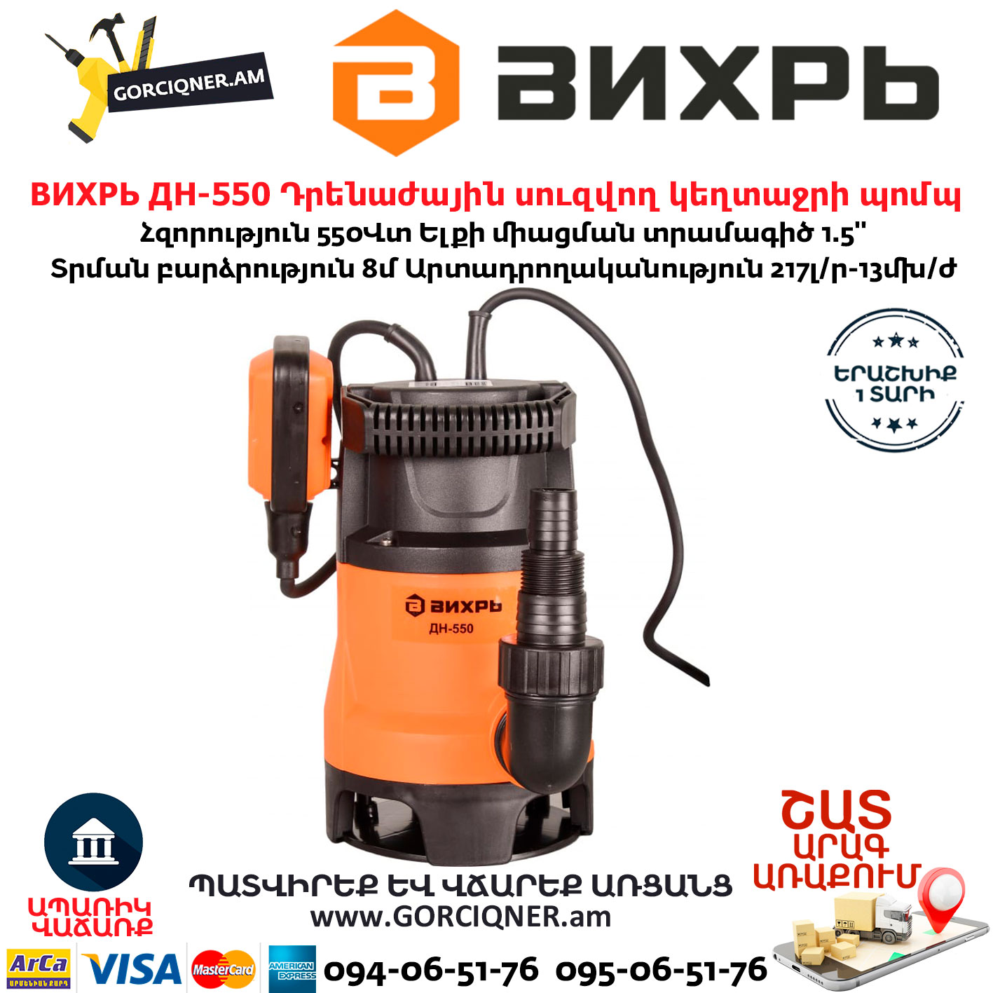 ВИХРЬ ДН-550 Дренажный насос 1.5”/550Вт
