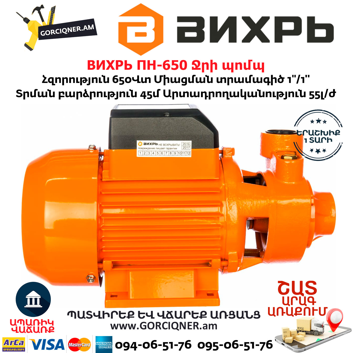 ВИХРЬ ПН-650 Поверхностный насос 1”/1” 650Вт