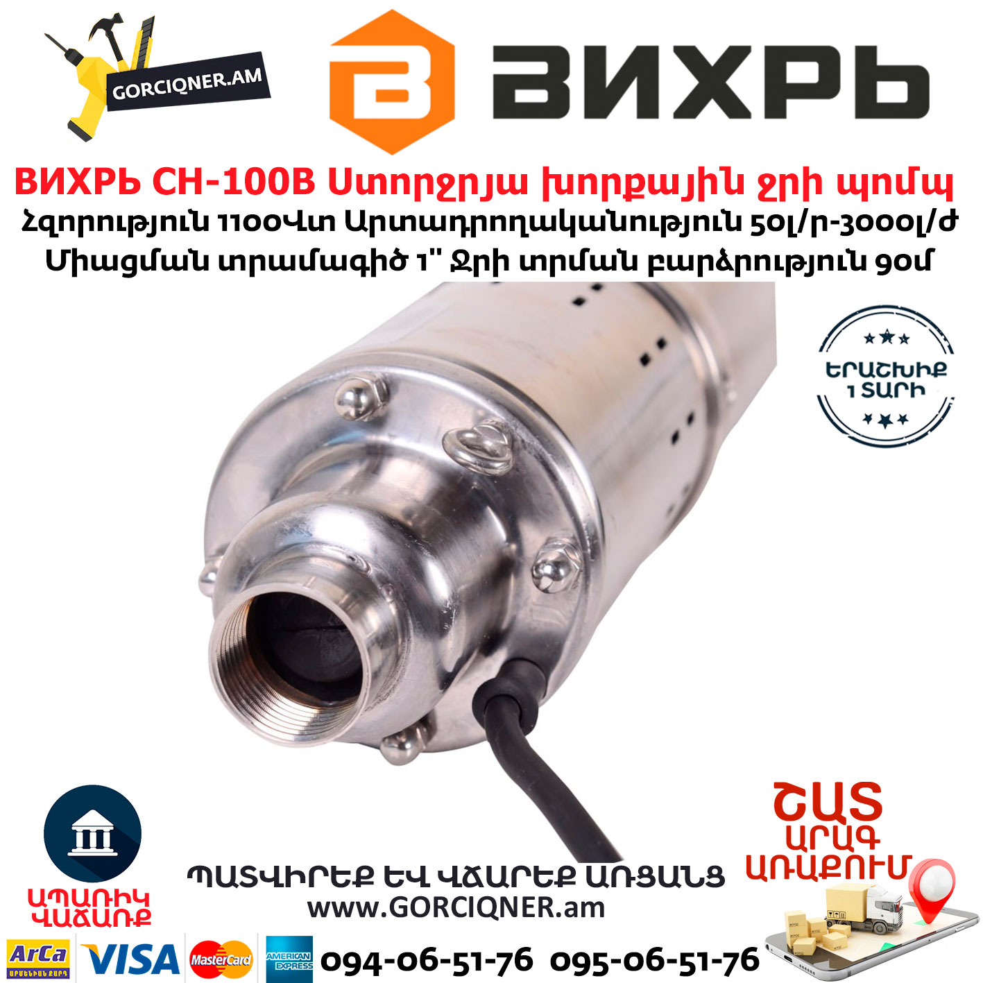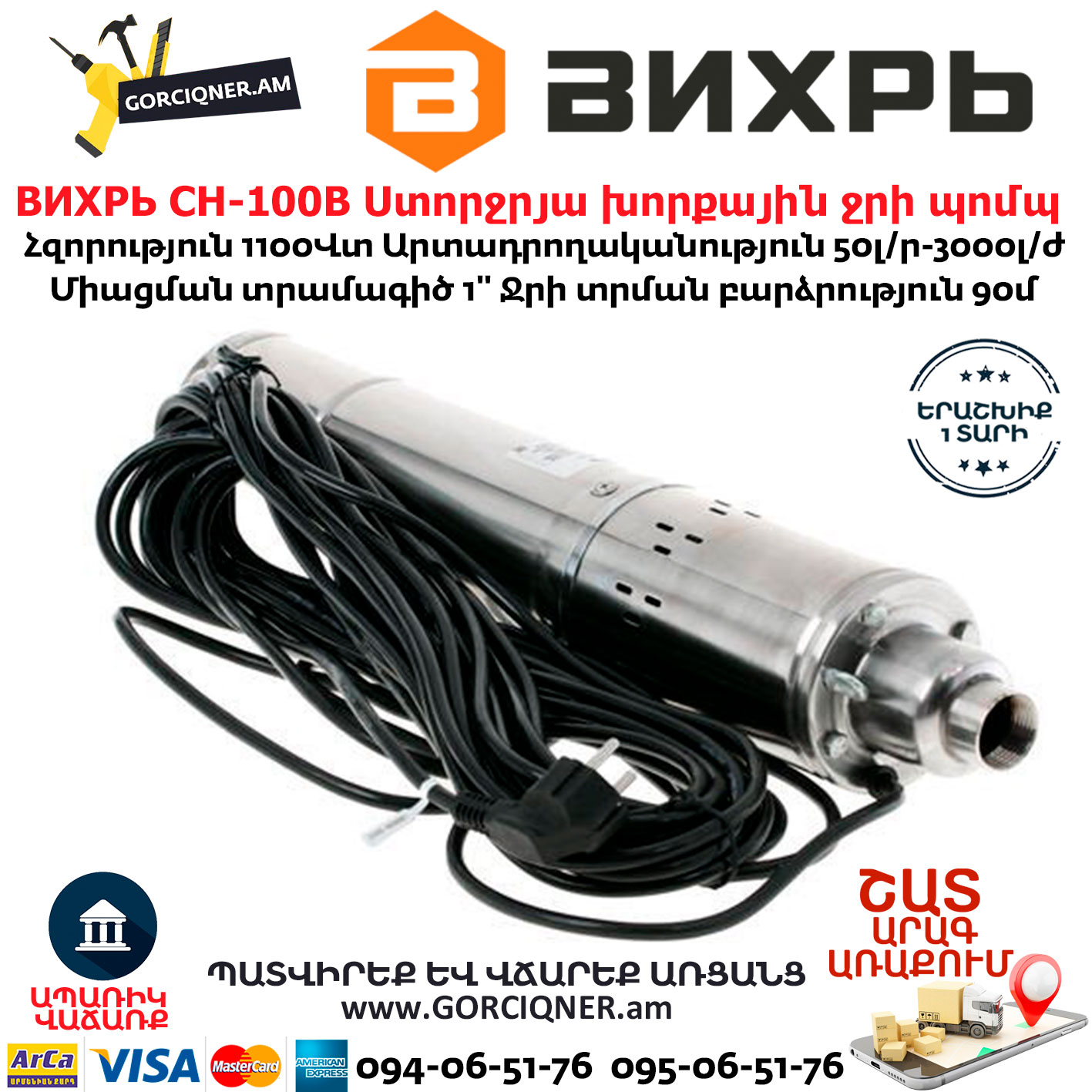 Скважинный насос Вихрь СН-100В предназначен для подачи воды в бытовых условиях из скважин, могут использоваться также для подачи воды из шахтных колодцев, резервуаров и открытых водоемов для полива садов и огородов. По степени защиты от поражения электрическим током электронасос относится к погружным насосам класса IPX8 и может работать полностью погруженным в воду на глубину до 40 метров. При этом расстояние от дна скважины до насоса не должно быть менее 0,6 метра. Насос СН-100В относится к вихревому типу, основным его преимуществом является создание высокого давления при малой подаче воды, поэтому насос лучше всего использовать для подачи воды из малодебитных скважин.