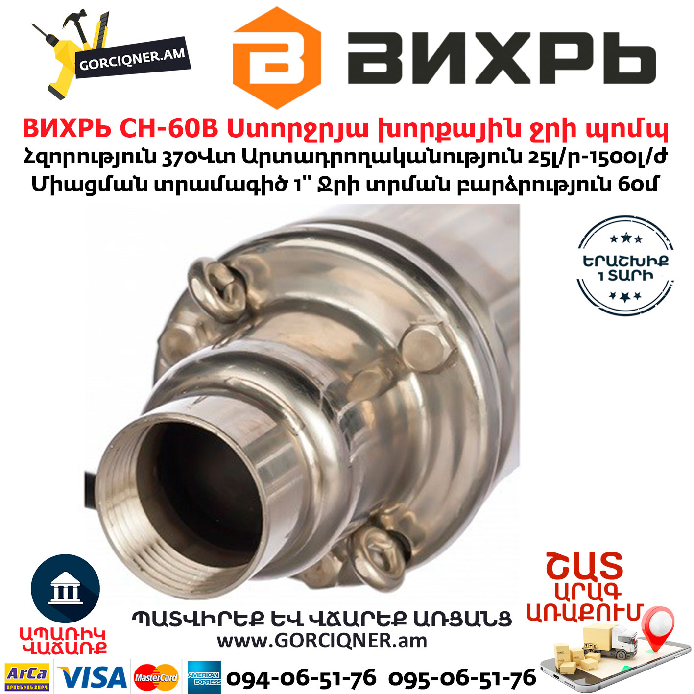 ВИХРЬ СН-60В Скважинный насос 370Вт/1՛՛
