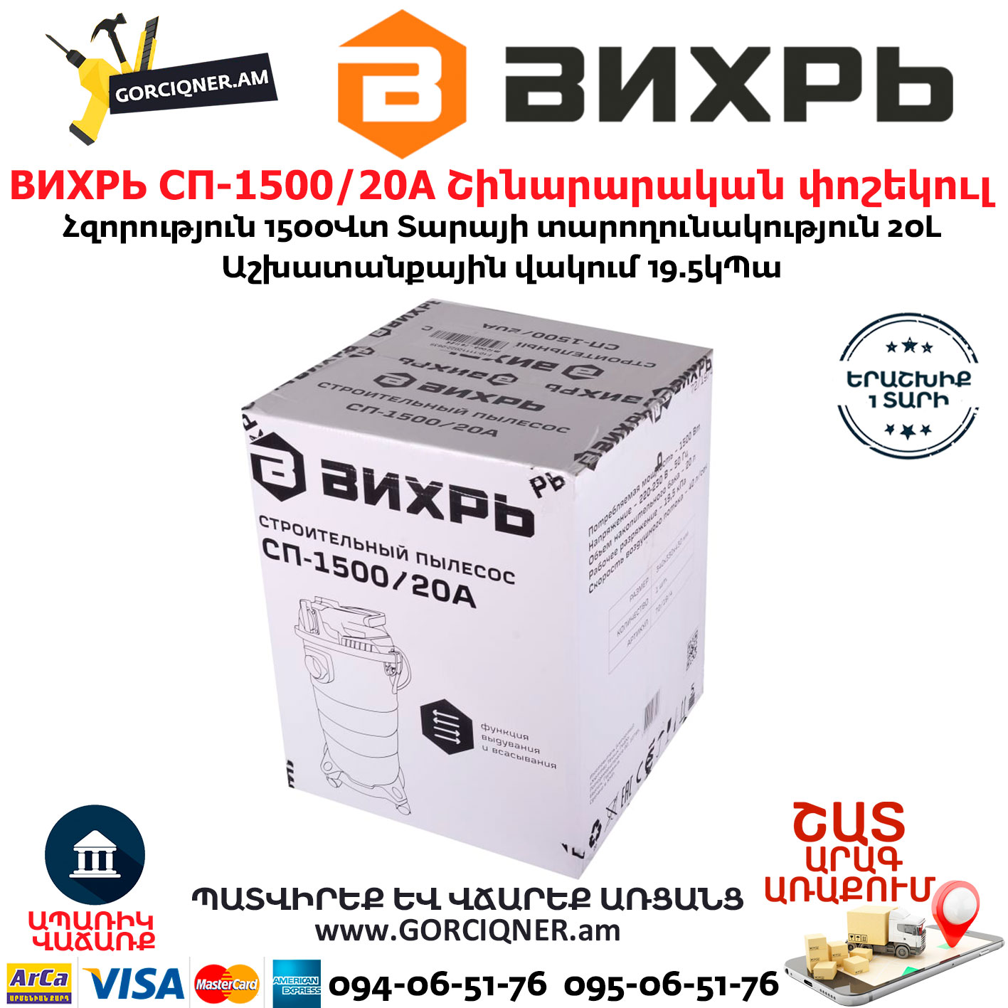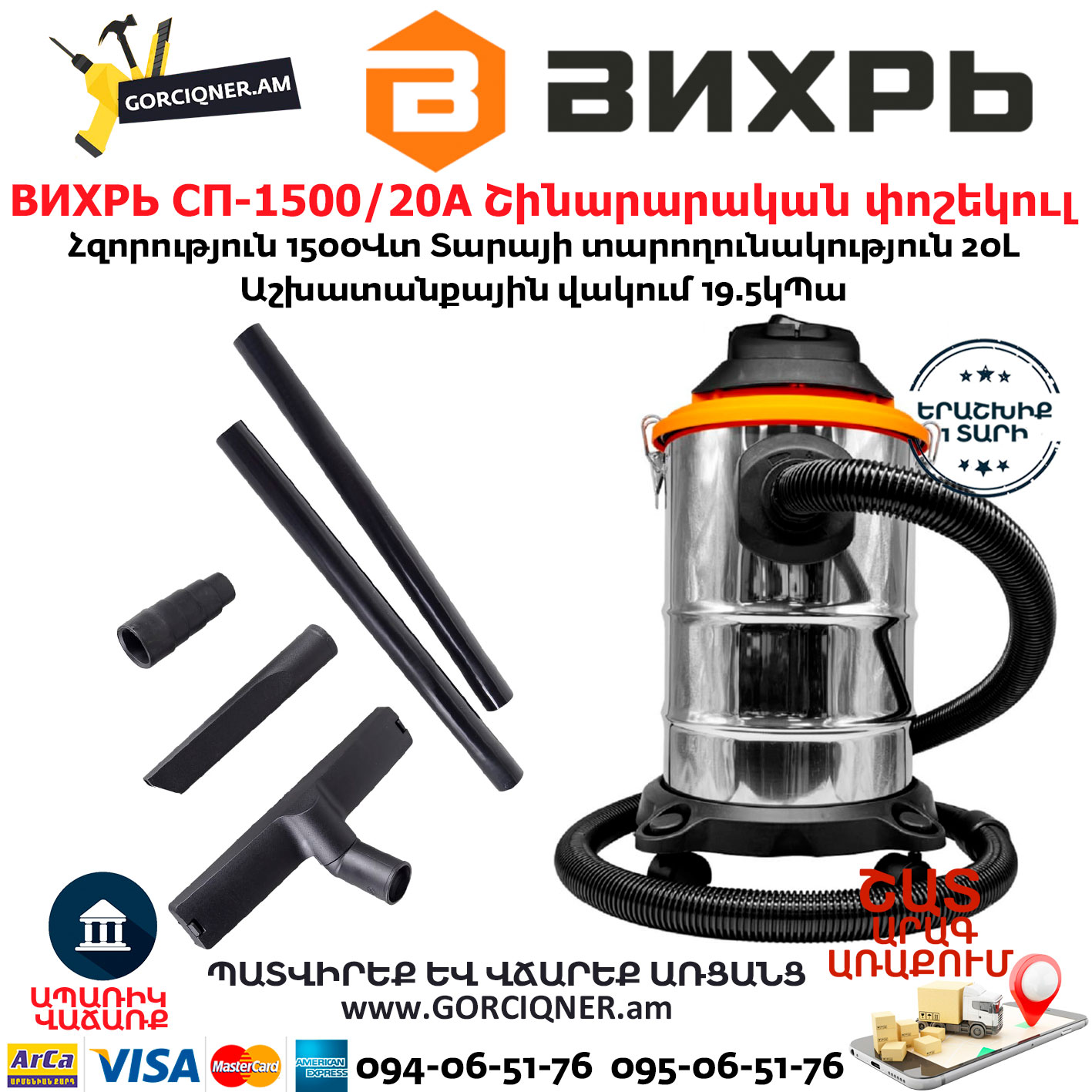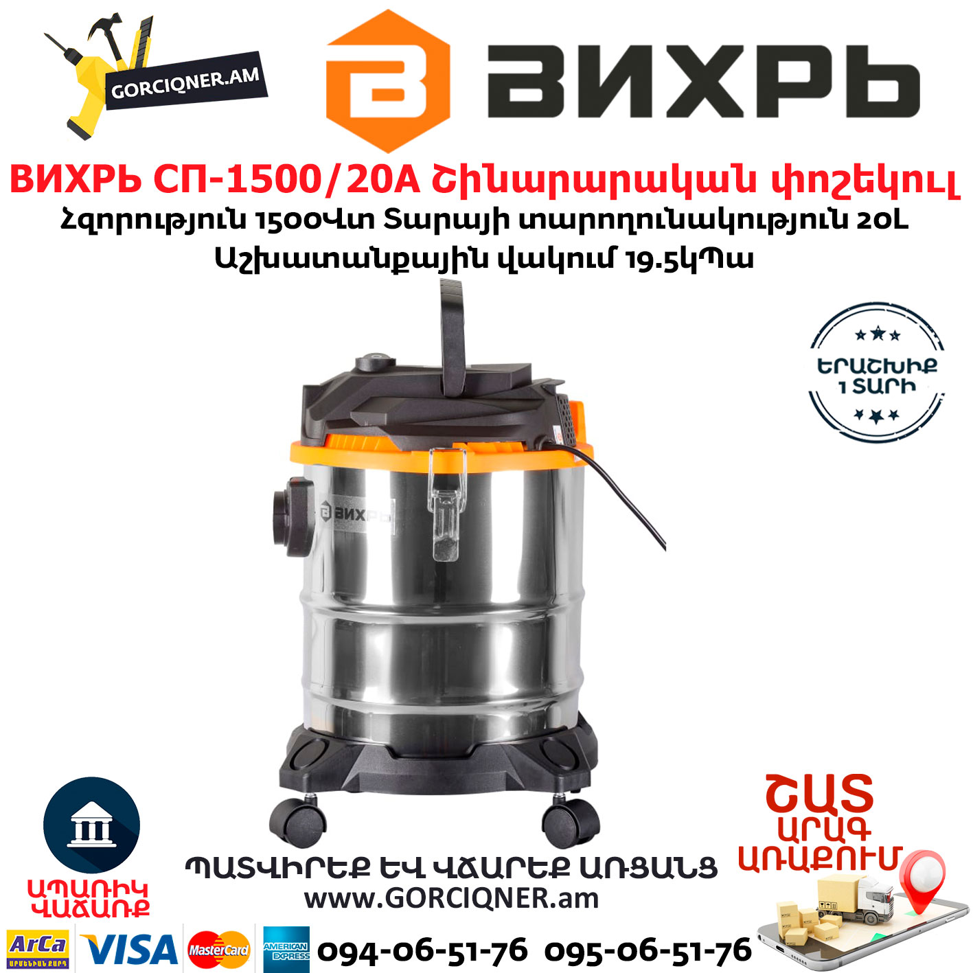 Строительный пылесос СП-1500/20 Вихрь предназначен для сухой и влажной уборки помещений, а также для совместного использования с электроинструментом при принудительном удалении продуктов сгорания, пиления. Может убирать крупные частицы мусора, а также воду.