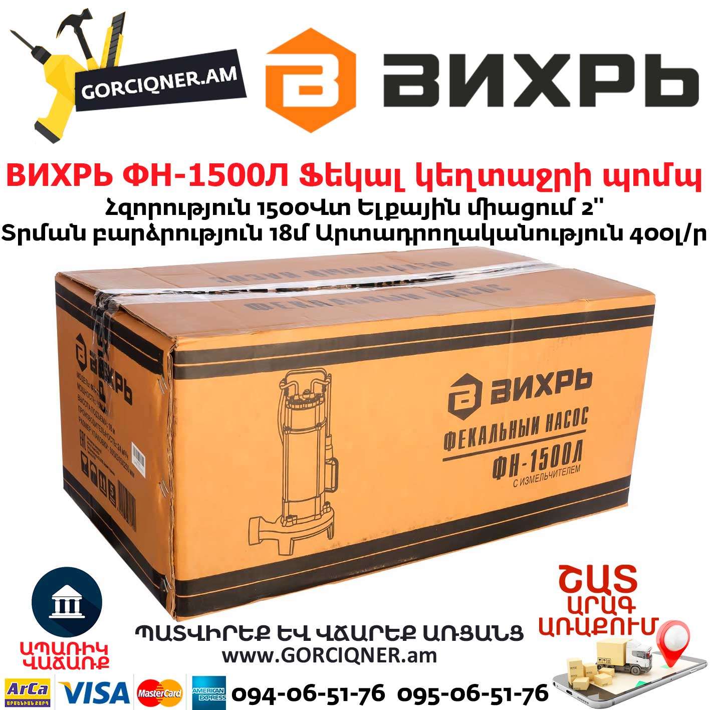 Фекальный насос Вихрь ФН-1500Л используют для откачки загрязненной жидкости, в том числе с волокнистыми включениями. Конструкция имеет измельчающее лезвие, что позволяет дробить частицы до пропускного размера в 1,5 см. Устройство применимо для откачки воды из сточных ям, затопленных подвалов, погребов, водоемов.