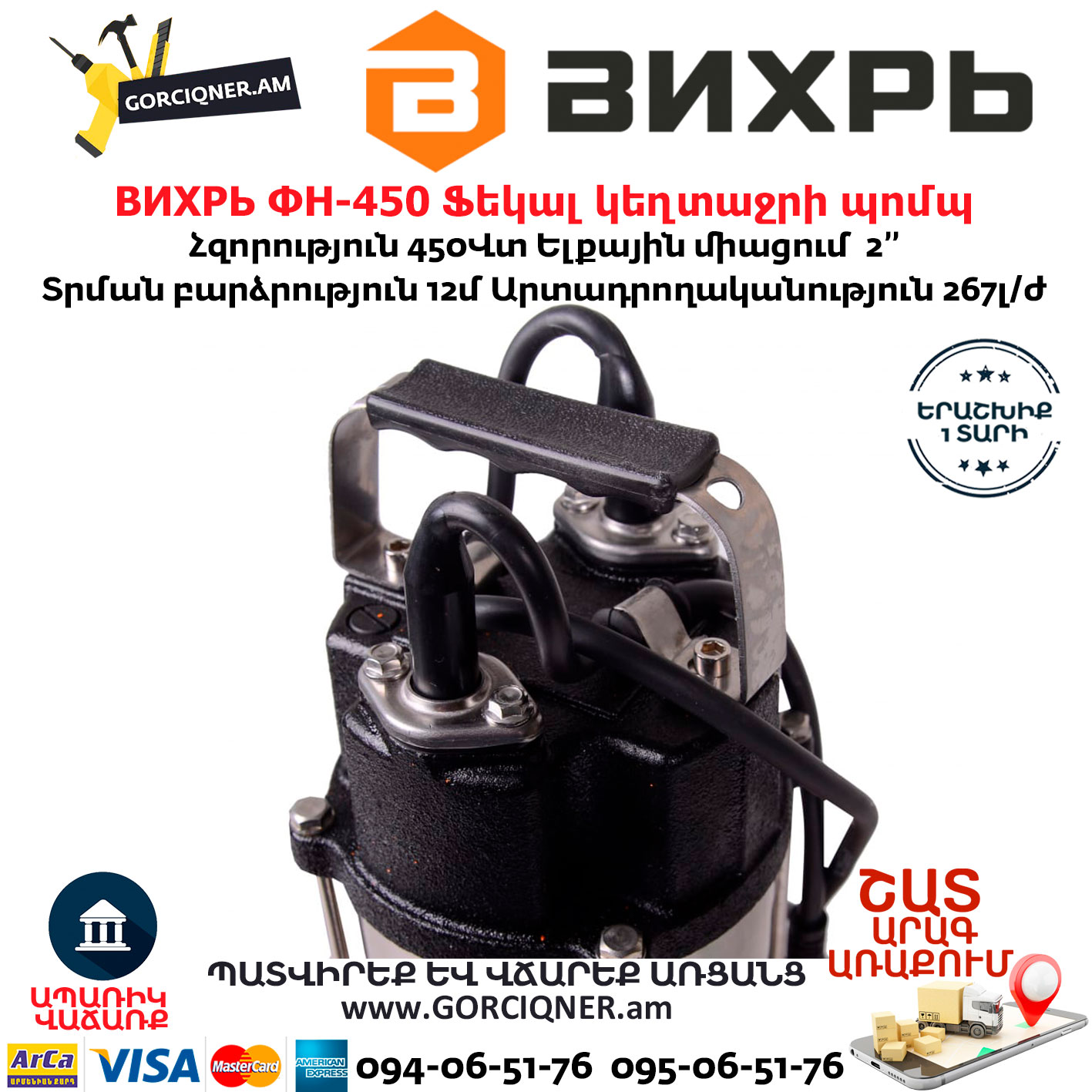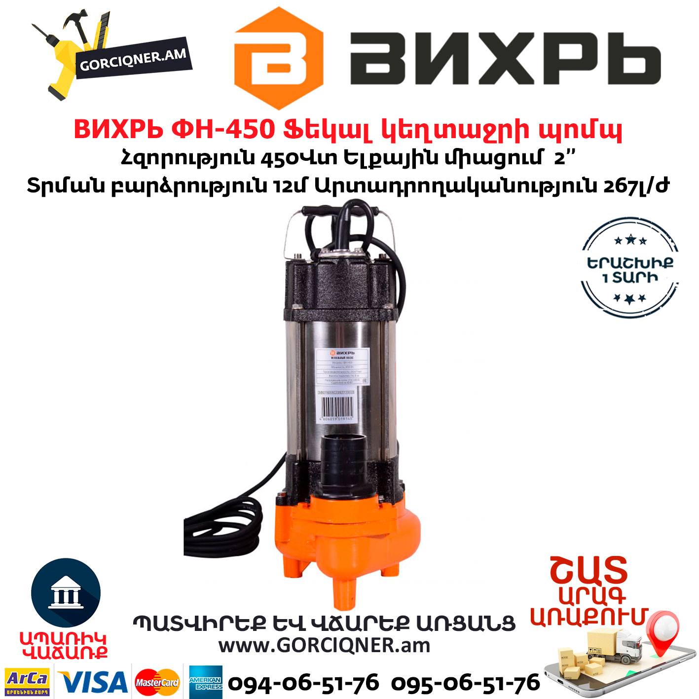 Фекальный насос Вихрь ФН-450 предназначен для откачки загрязненных бытовых, сточных и смешанных вод, содержащих крупные включения, воды из рек, водоемов, также фекальные насосы используются для орошения, подачи воды с глубины. Агрегат состоит из насосной части, электродвигателя и поплавкового включателя. В состав электродвигателя входит статор, состоящий из двух обмоток с термопротектором. Устройство относится к погружным насосам, особенностью которых является то, что механизм находится ниже уровня выкачиваемой жидкости. Насос размещается в подвешенном состоянии или на специальной платформе, чтобы не затянуть ил или песок со дна. Специальный поплавковый механизм позволяет насосу включаться в момент, когда уровень жидкости достигает критичного уровня.