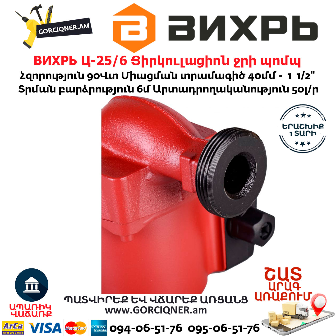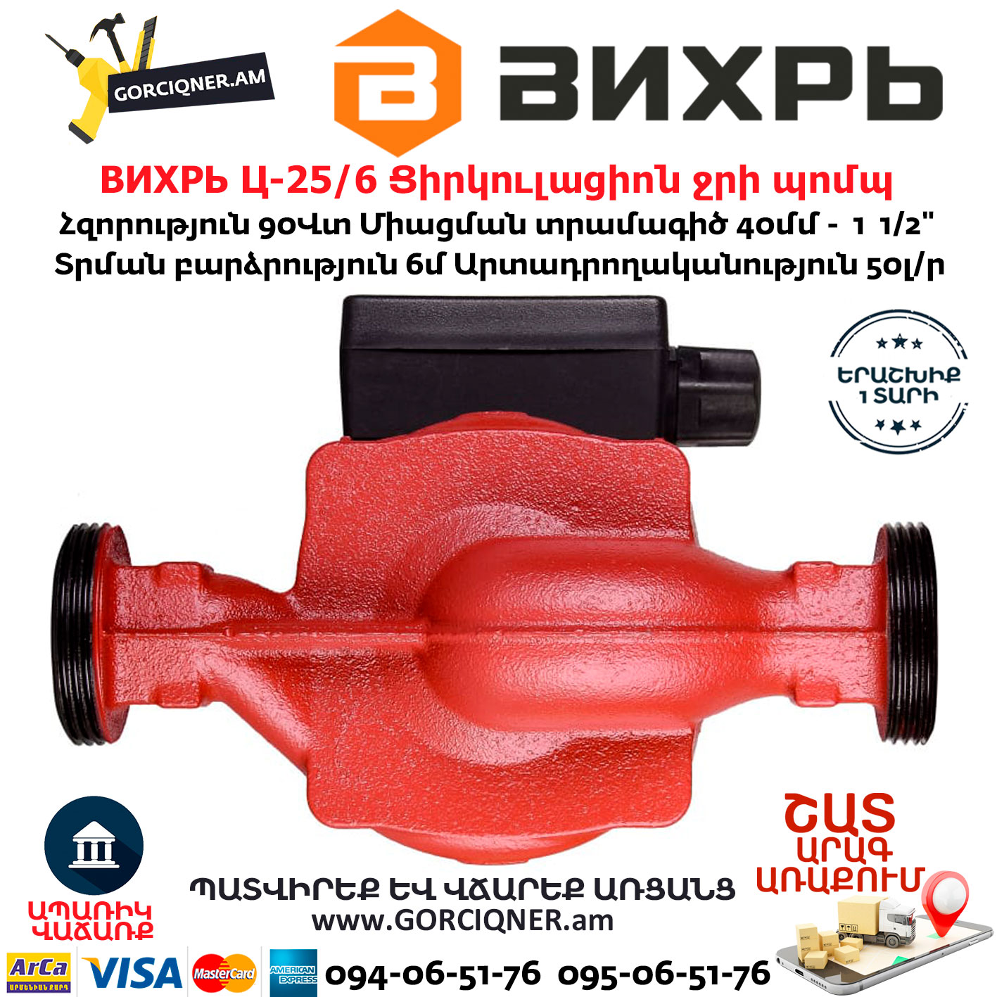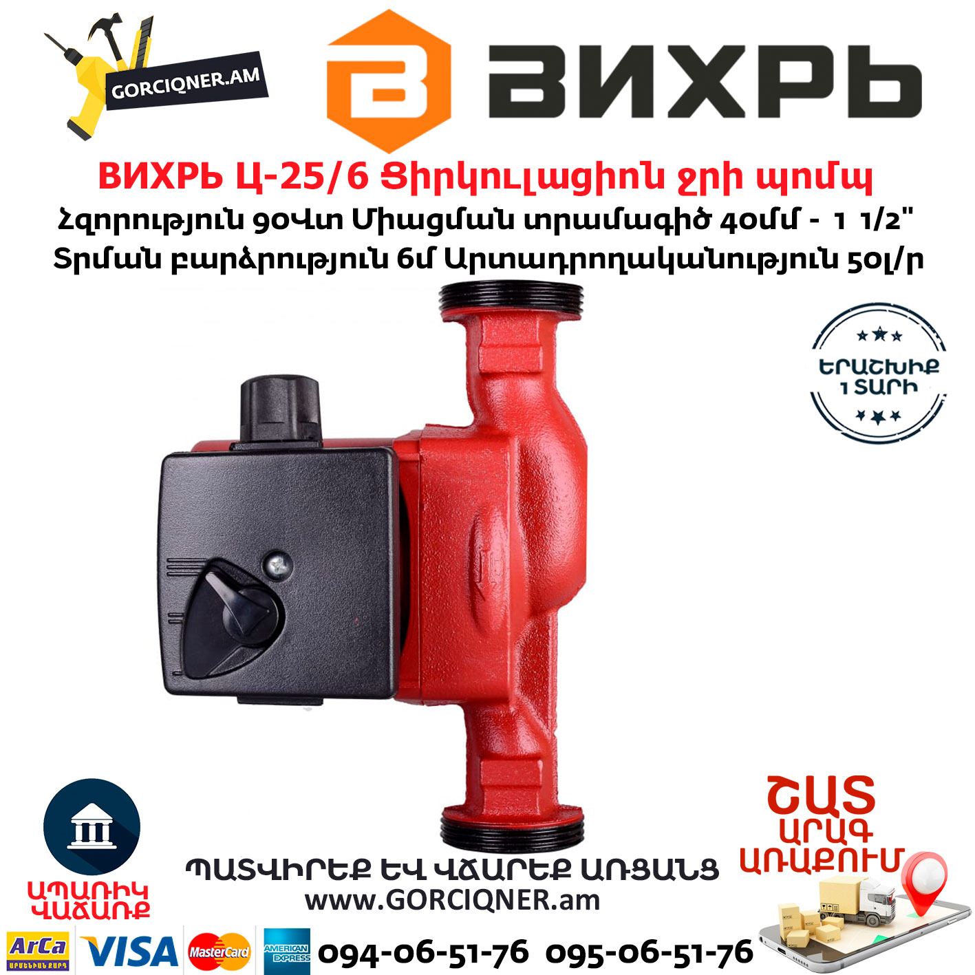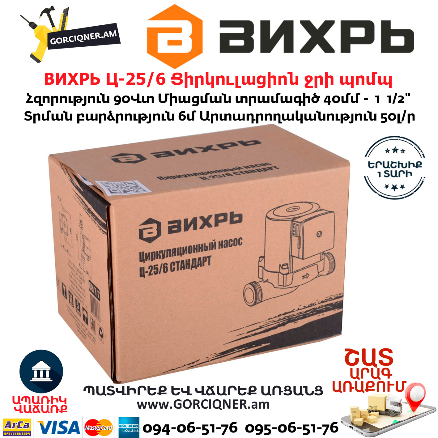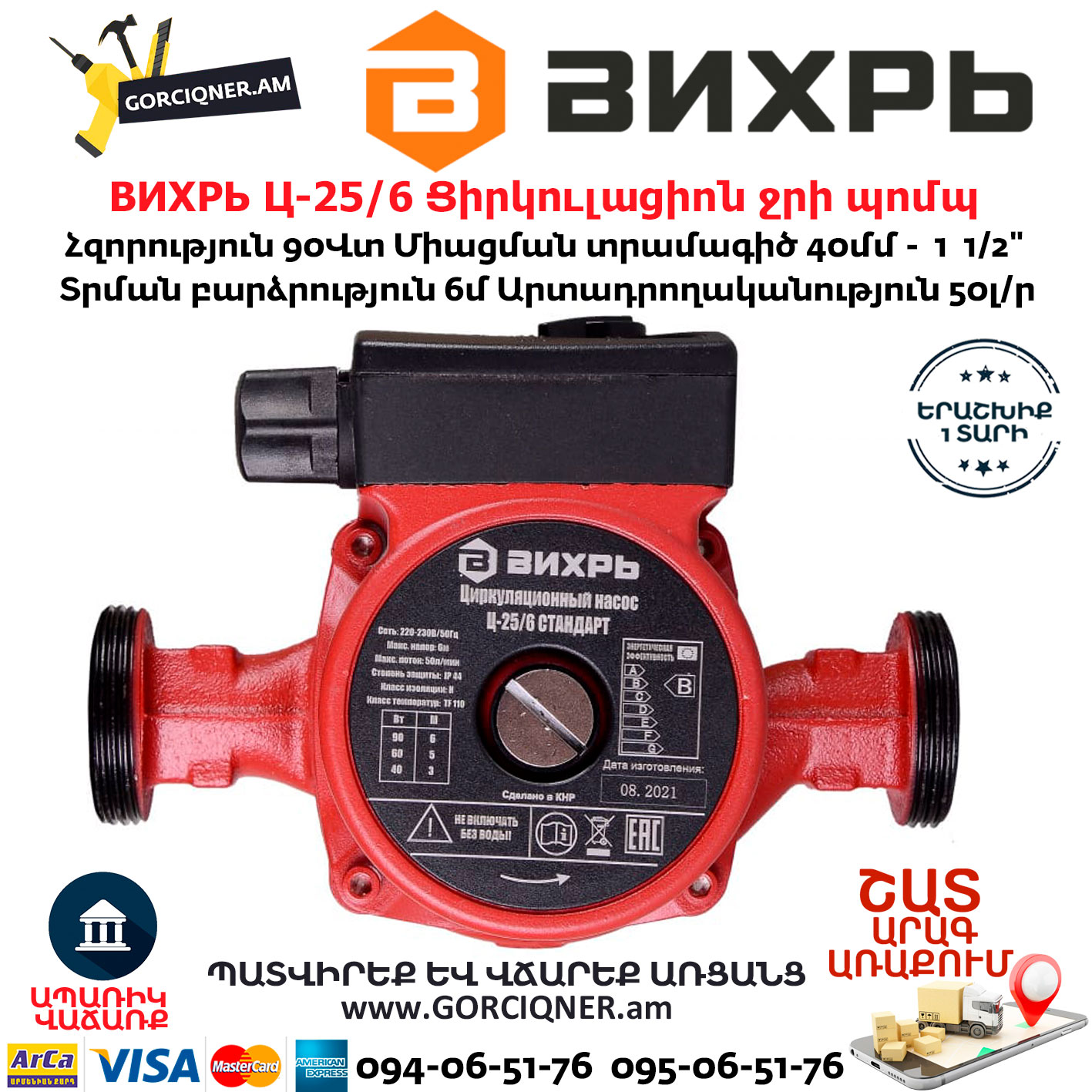 Циркуляционный насос Вихрь Ц-25/6 предназначен для обеспечения циркуляции воды в системах отопления, круговых трубопроводах горячего и холодного водоснабжения, центральных отопительных установках и системах перекачки промышленных вод, системах кондиционирования, охлаждения. Насос представляет собой компактное устройство с всасывающей и нагнетающей функциями, вода перекачивается при помощи вращения рабочего колеса электродвигателем насоса. Насос имеет три скорости работы, выбираемые ручным переключением вращающейся ручки на клеммной коробке.