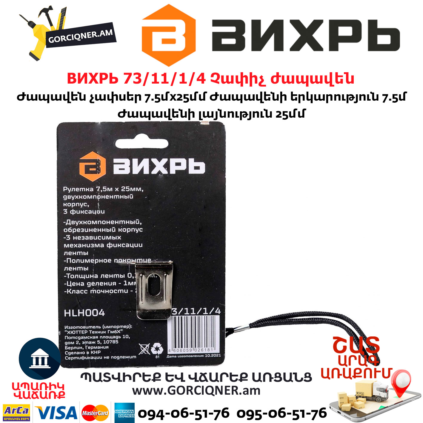 Рулетка 7,5мх25мм Вихрь 73/11/1/4 представляет собой компактный измерительный инструмент. Корпус изделия выполнен из двухкомпонентного ударопрочного пластика. Благодаря материалу рулетка устойчива к падениям и прочим механическим повреждениям. Также данная модель имеет 3 фиксации.