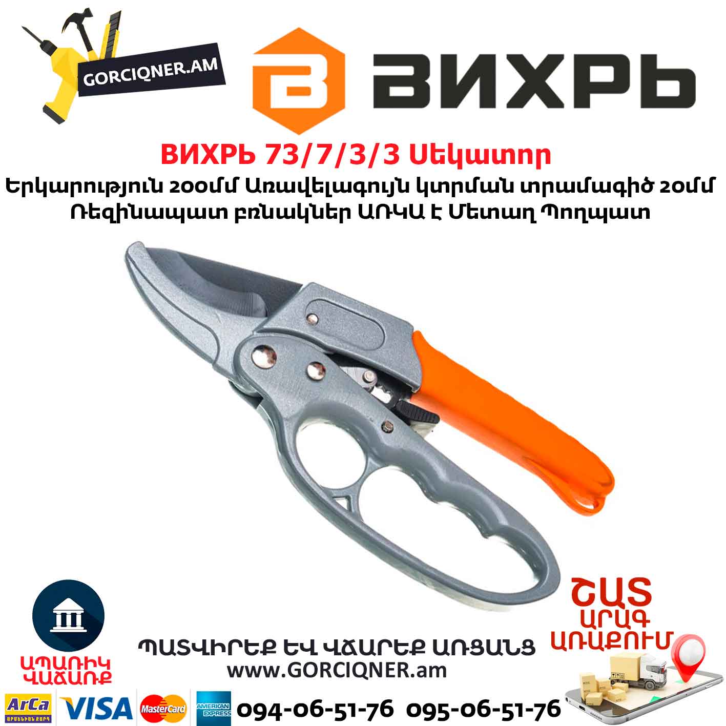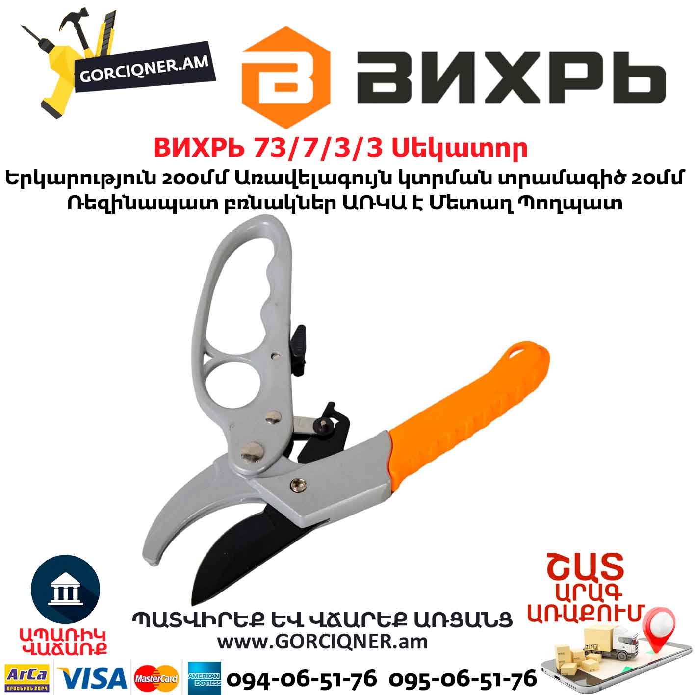 • Секатор 200 мм Вихрь 73/7/3/3 оснащён возвратной пружиной и храповым механизмом;