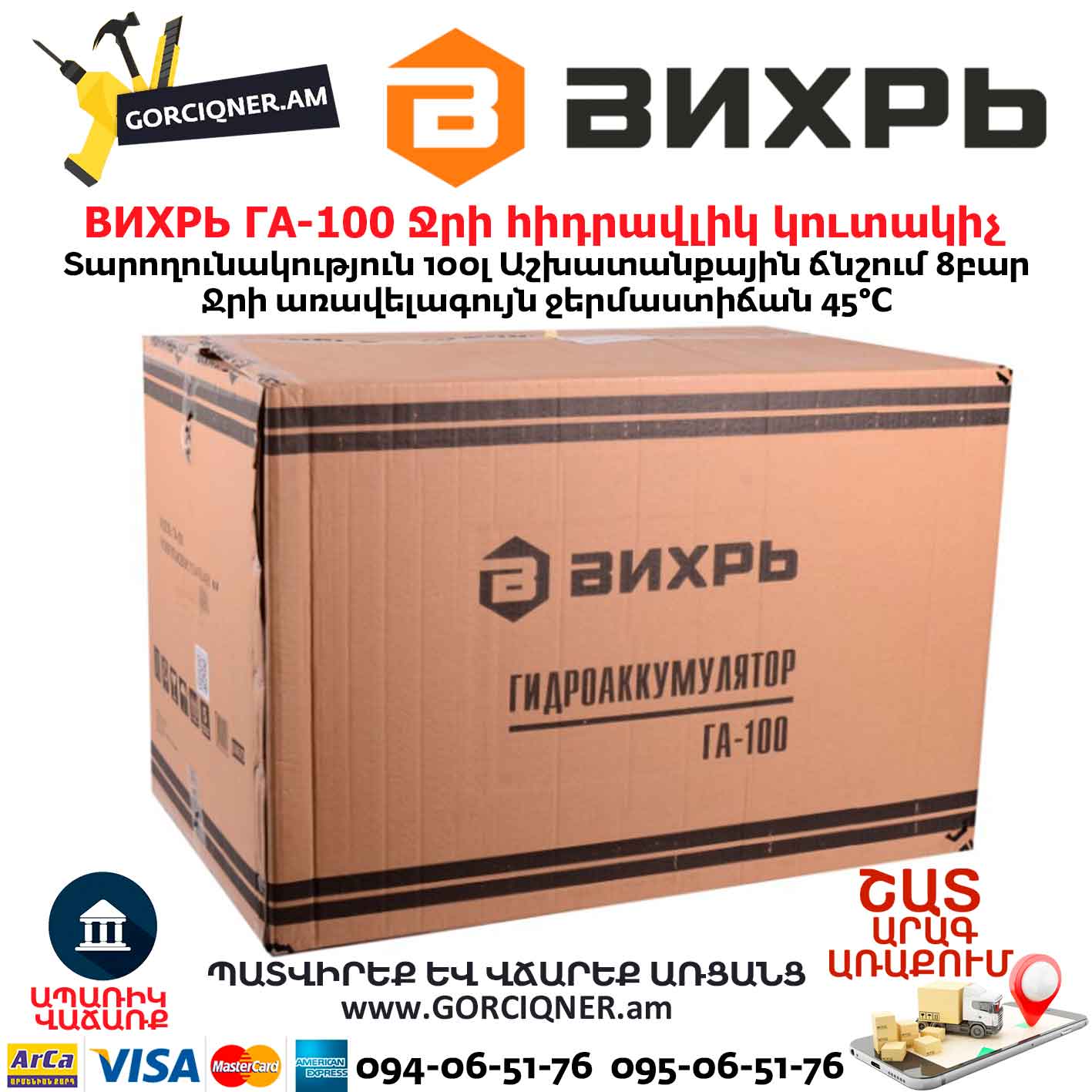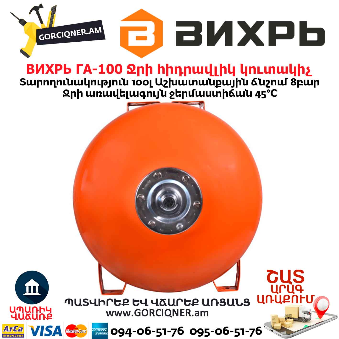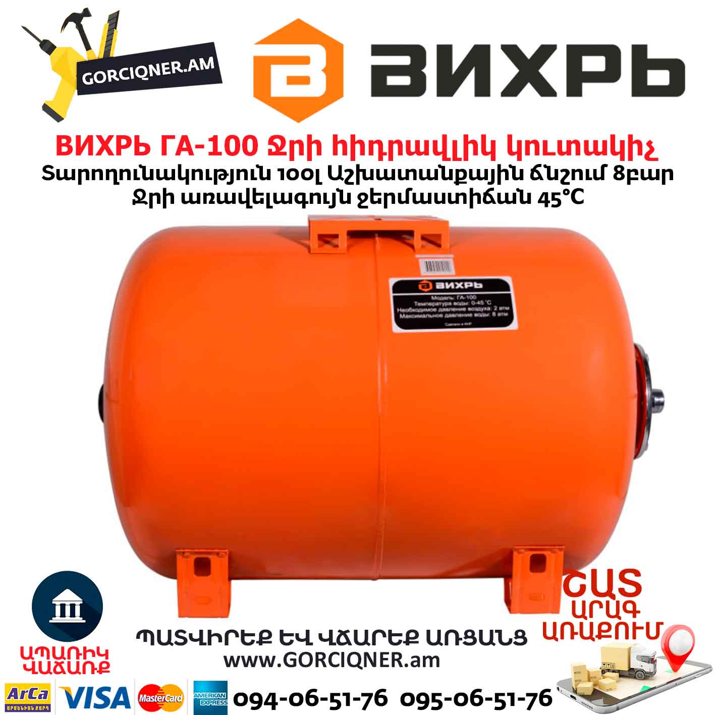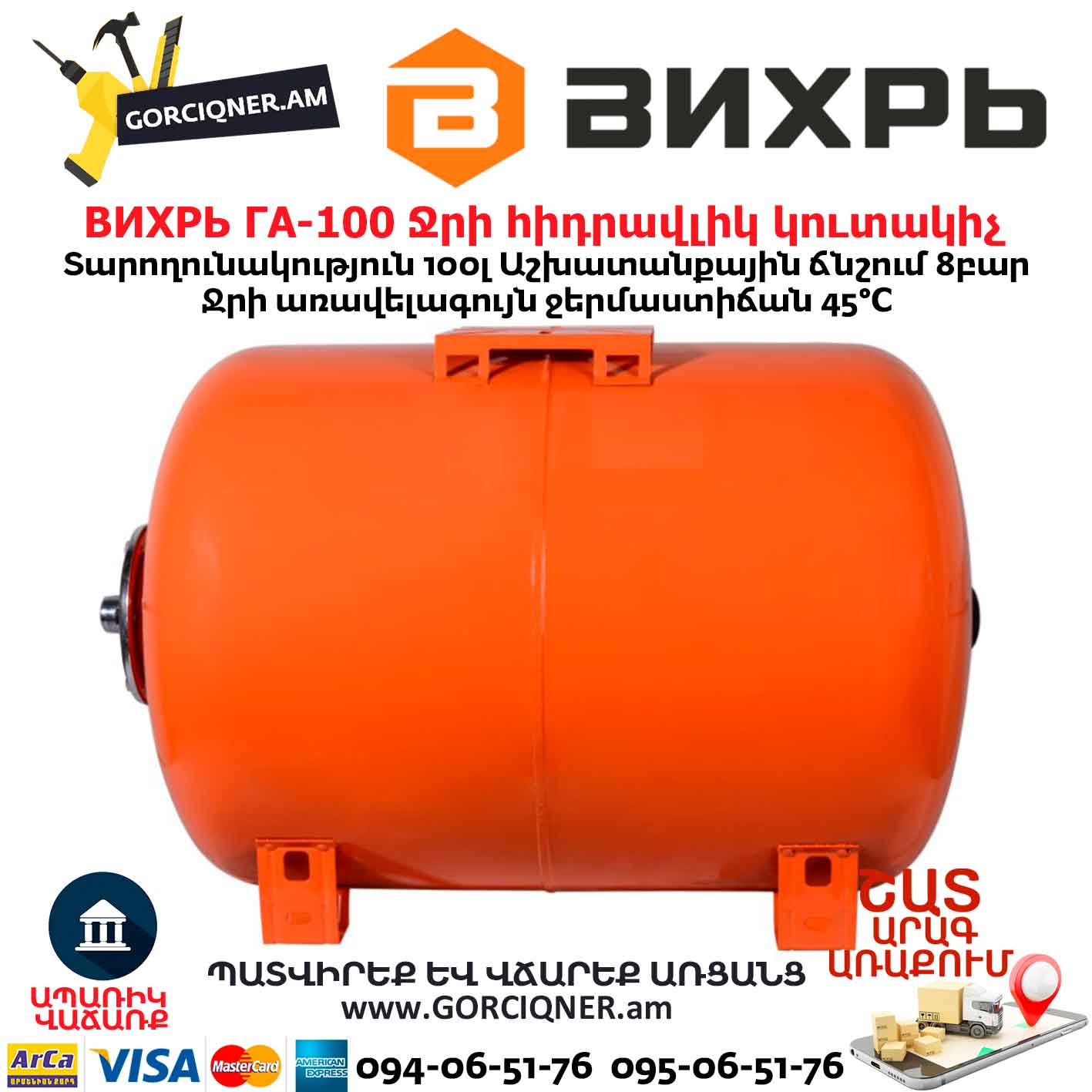 Гидроаккумулятор (гидробак) ВИХРЬ ГА-100 100л 68/6/3