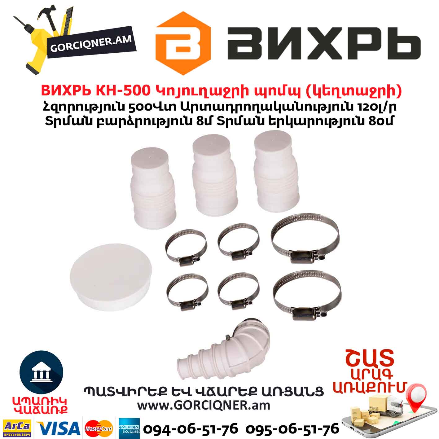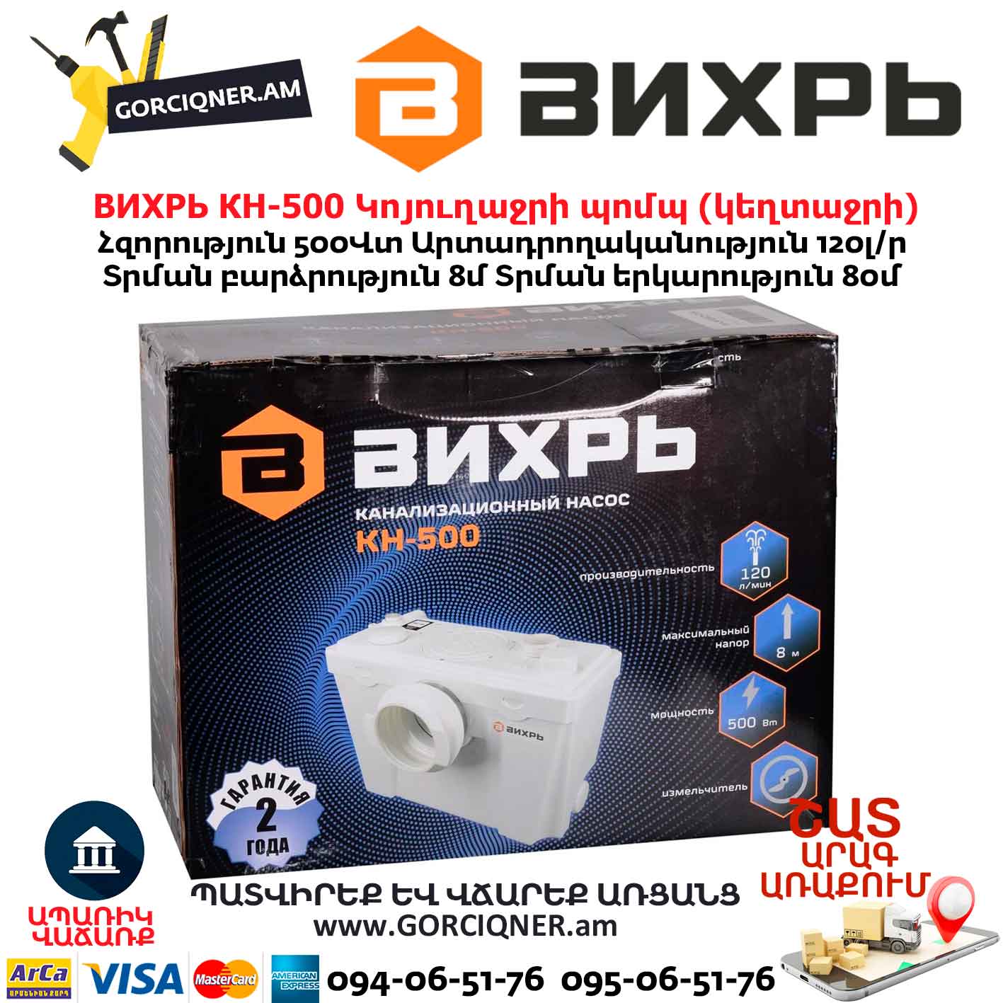 Канализационный насос Вихрь КН-500 поможет решить проблему отвода сточных вод в случае невозможности применения наклонных труб для подключения к канализации.